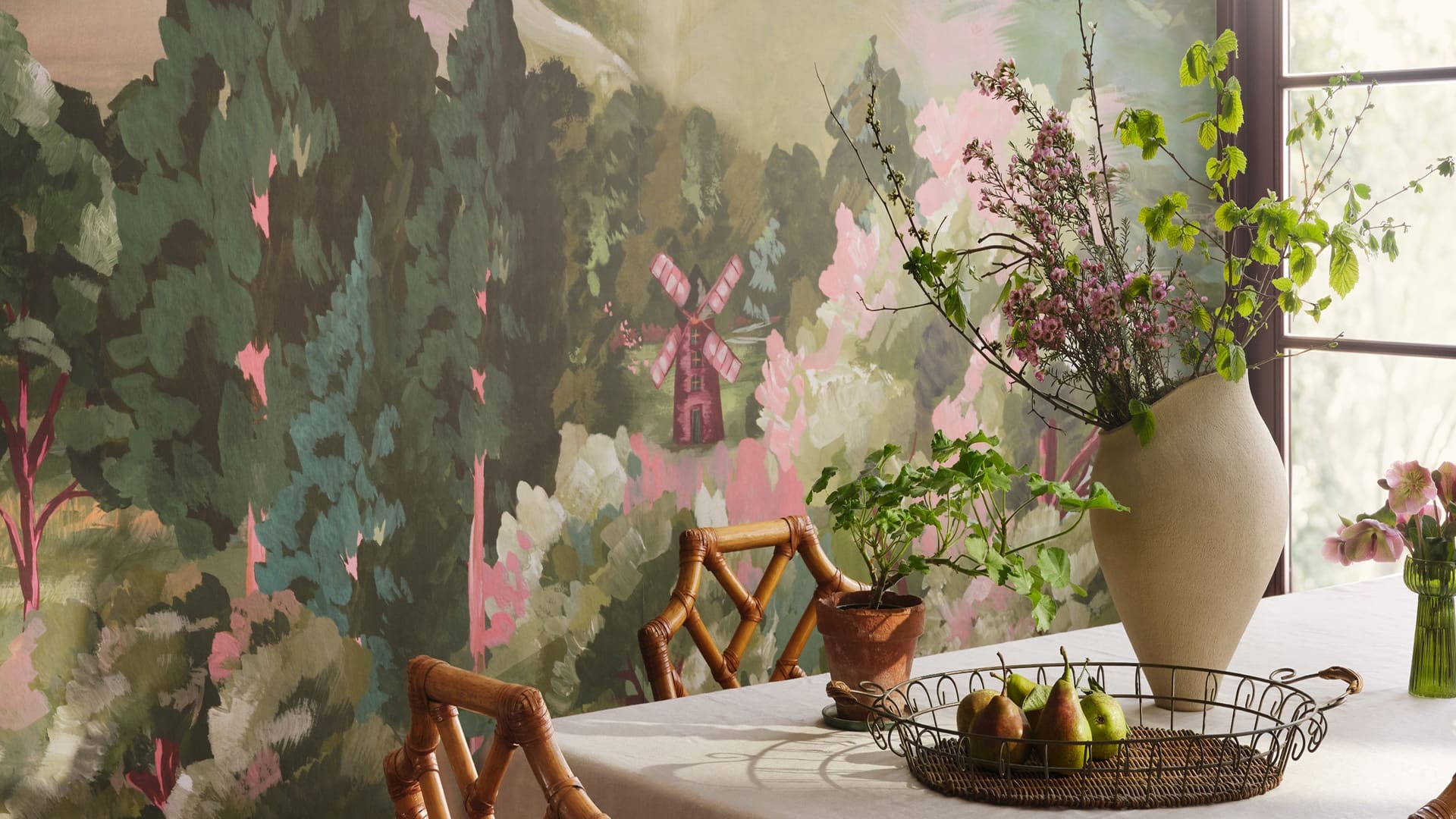 Painter’s Glasshouse is a fresh, light and versatile collection that balances elegant simplicity with understated luxury. Inspired by the atmosphere of an artist’s studio surrounded by nature, the collection brings together painterly landscapes, decorative botanicals and structured patterns that layer effortlessly within interiors.