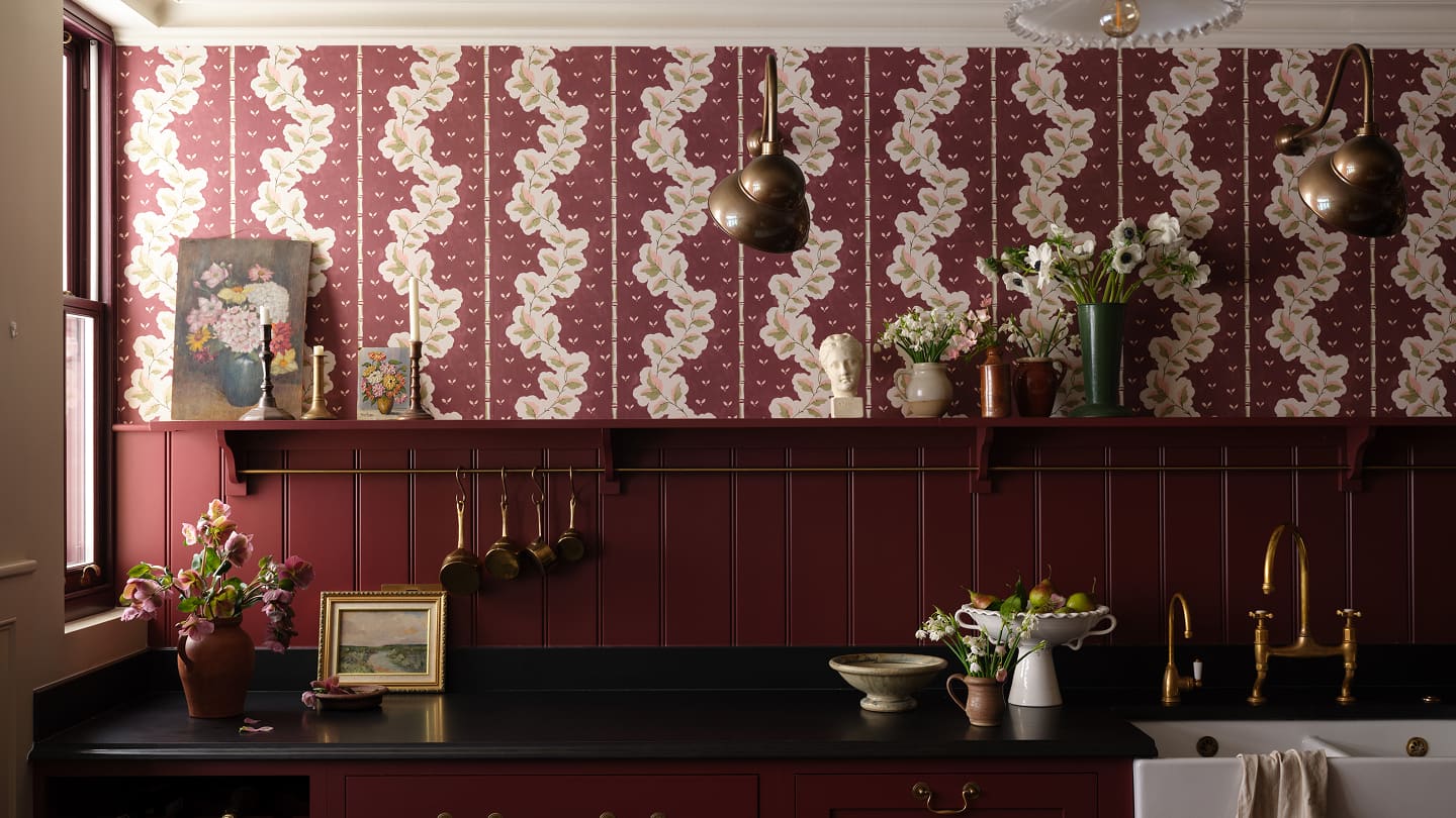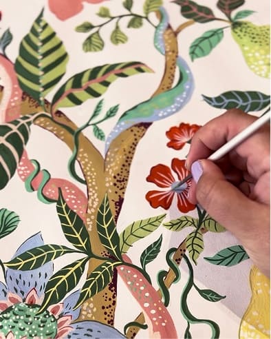 These botanical influences flow throughout Painter’s Glasshouse. Fruit trees, wildflowers and trailing vines appear in hand painted form, while layered colour and flat decorative treatments give each design clarity and character. The collection captures the feeling of nature growing alongside artistic expression, where garden and studio exist in creative harmony.