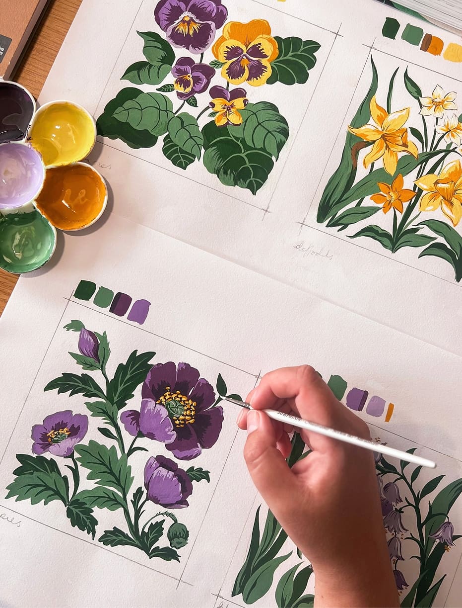 Inside the glasshouse studio, canvases lean against the walls, textiles drape across tables and sketches slowly evolve into pattern. It is a place shaped by craft and creativity, where artistic ideas develop through the rhythm of making.