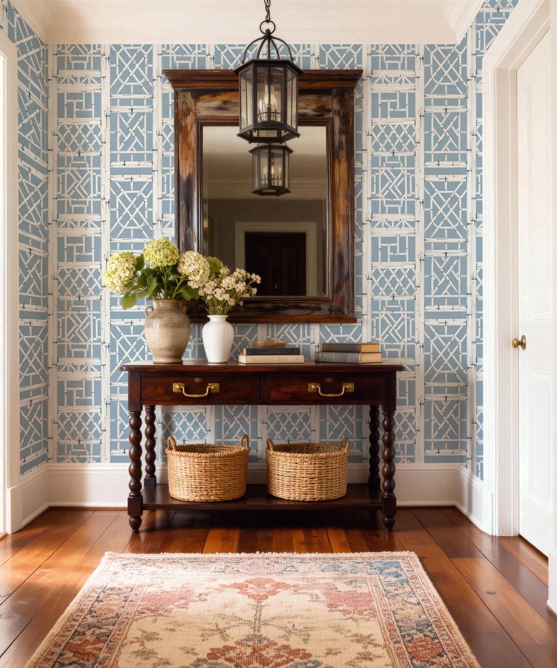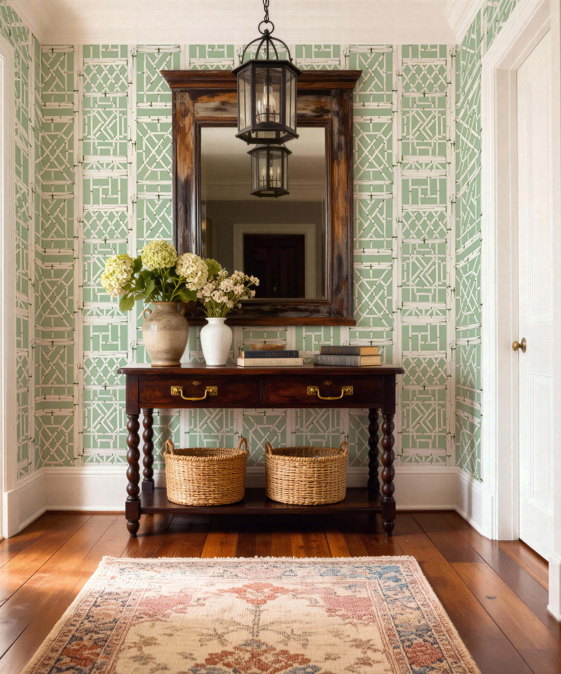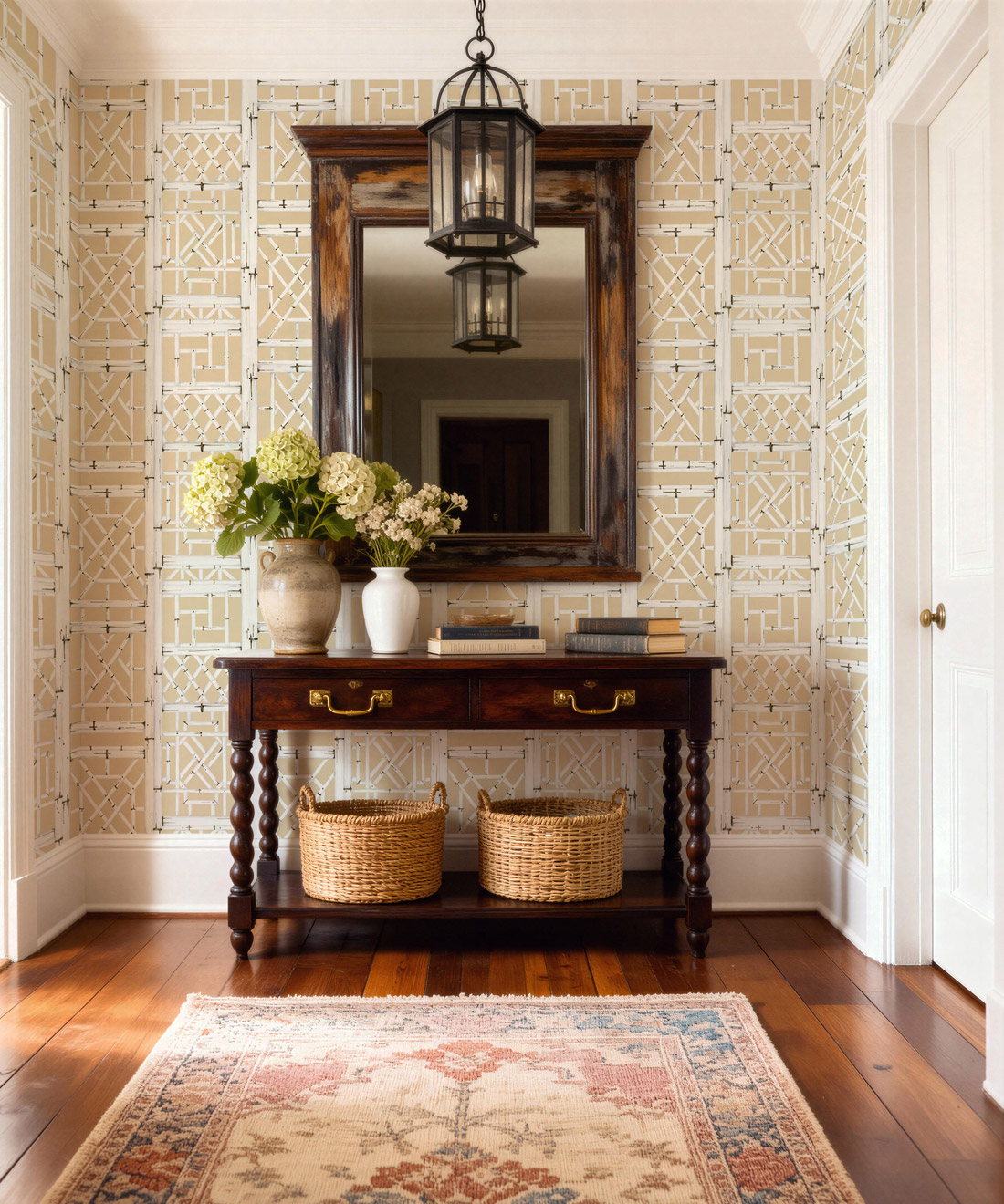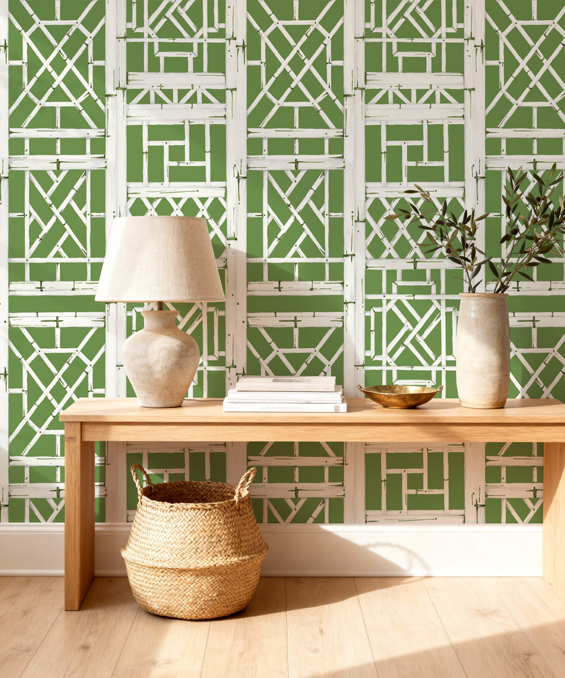 Briland is a large-scale bamboo trellis that channels old West Palm Beach glamour. The hand-painted design evokes both elegance and polished refinement. It adds luminous texture and a touch of American classicism and is ideal for dining rooms, entryways or sunrooms that invite a sense of joyful sophistication.