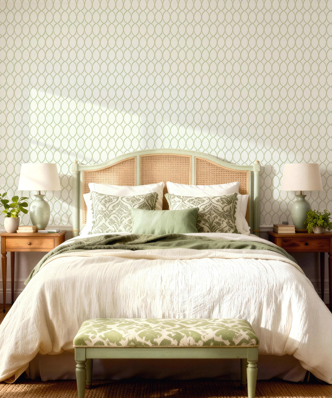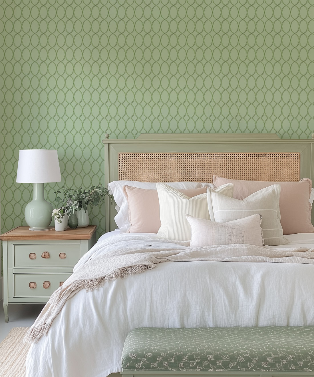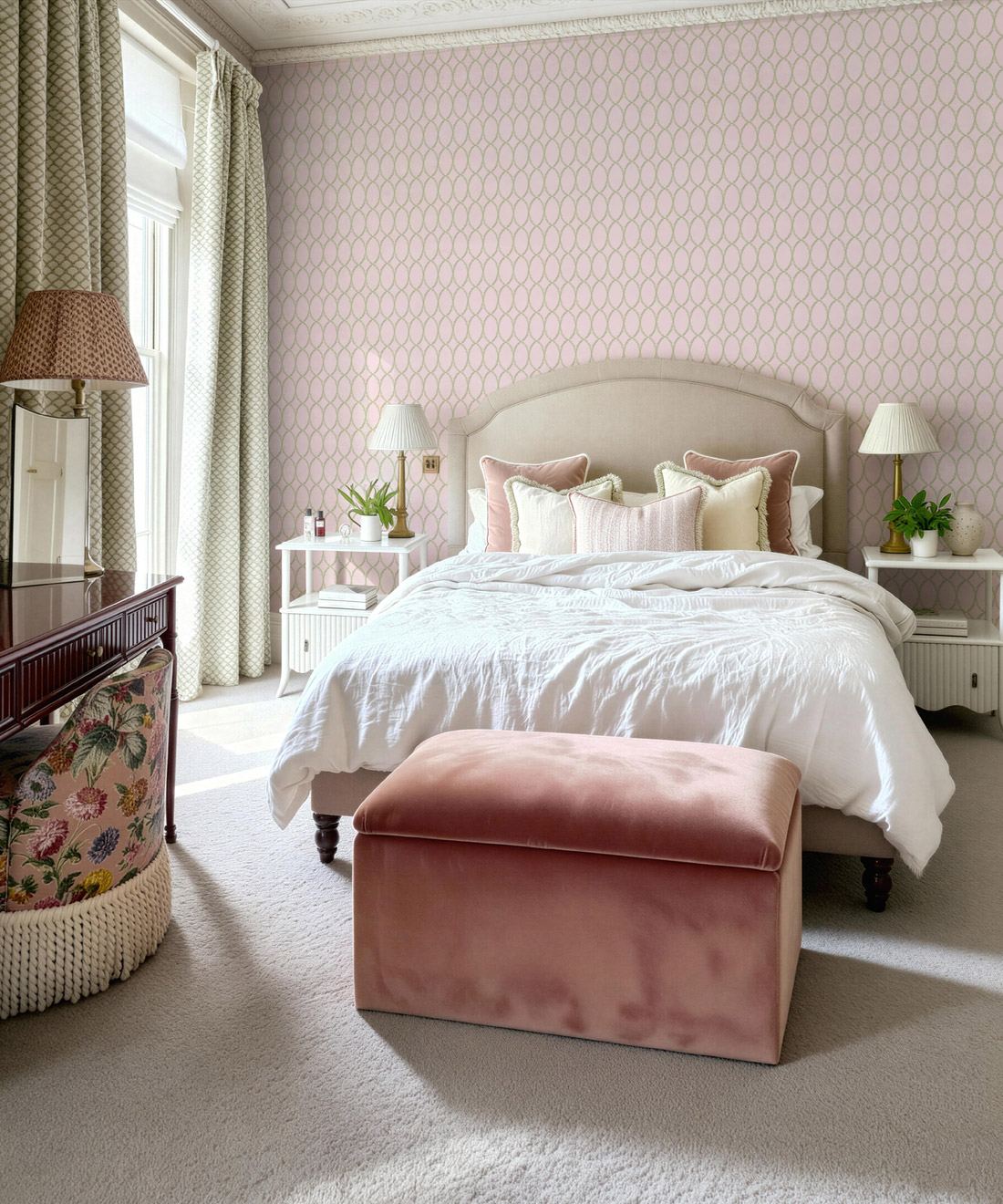 Chloe’s delicate oval vine motif is drawn from Georgian plasterwork. The hand-painted design offers softness and polish in equal measure. With its classic geometry and refined simplicity, Chloe works beautifully in bedrooms, dining areas or kitchens where quiet elegance is key.