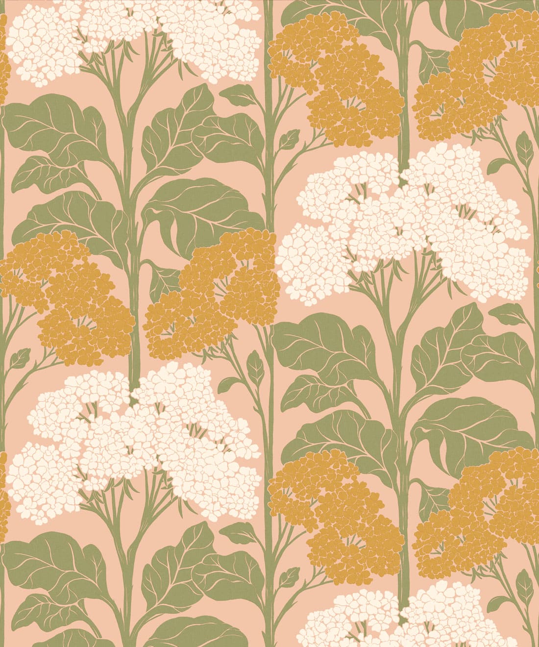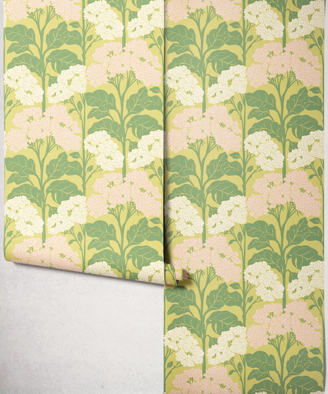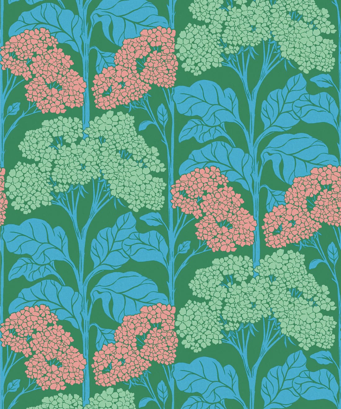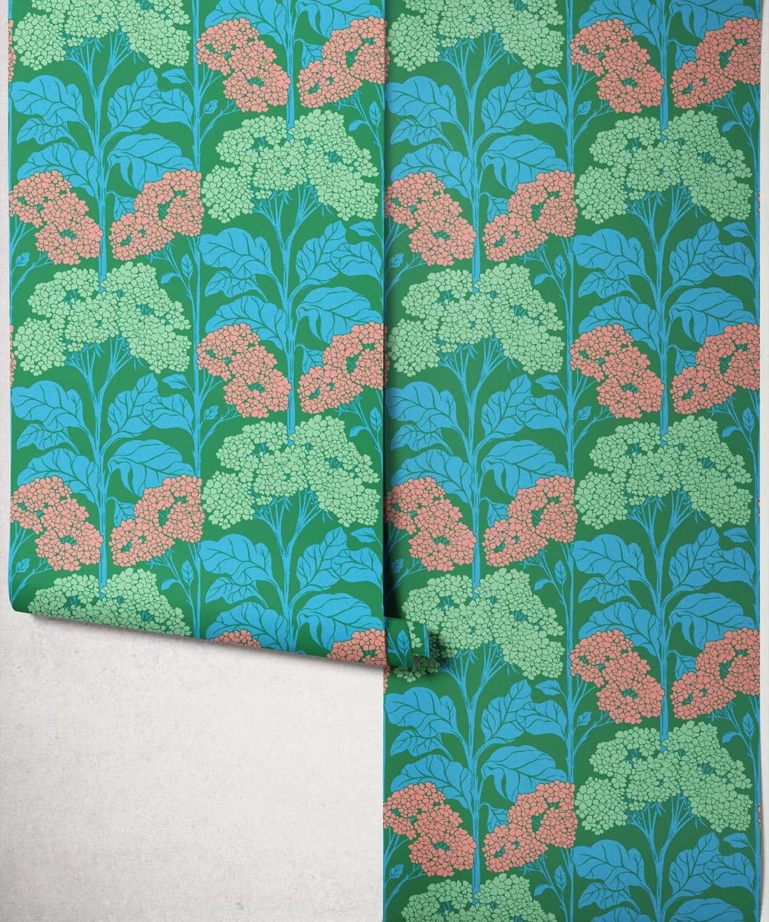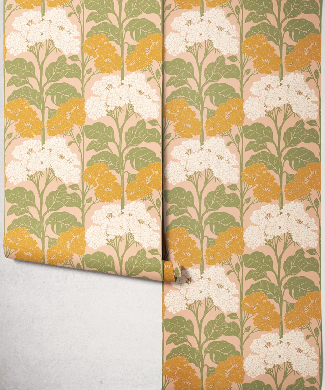 Influenced by Art Nouveau composition, the pattern balances organic form with graphic structure. Flat colour treatments and bright retro colourways bring playful nostalgia and a lighthearted sense of charm to the wall.