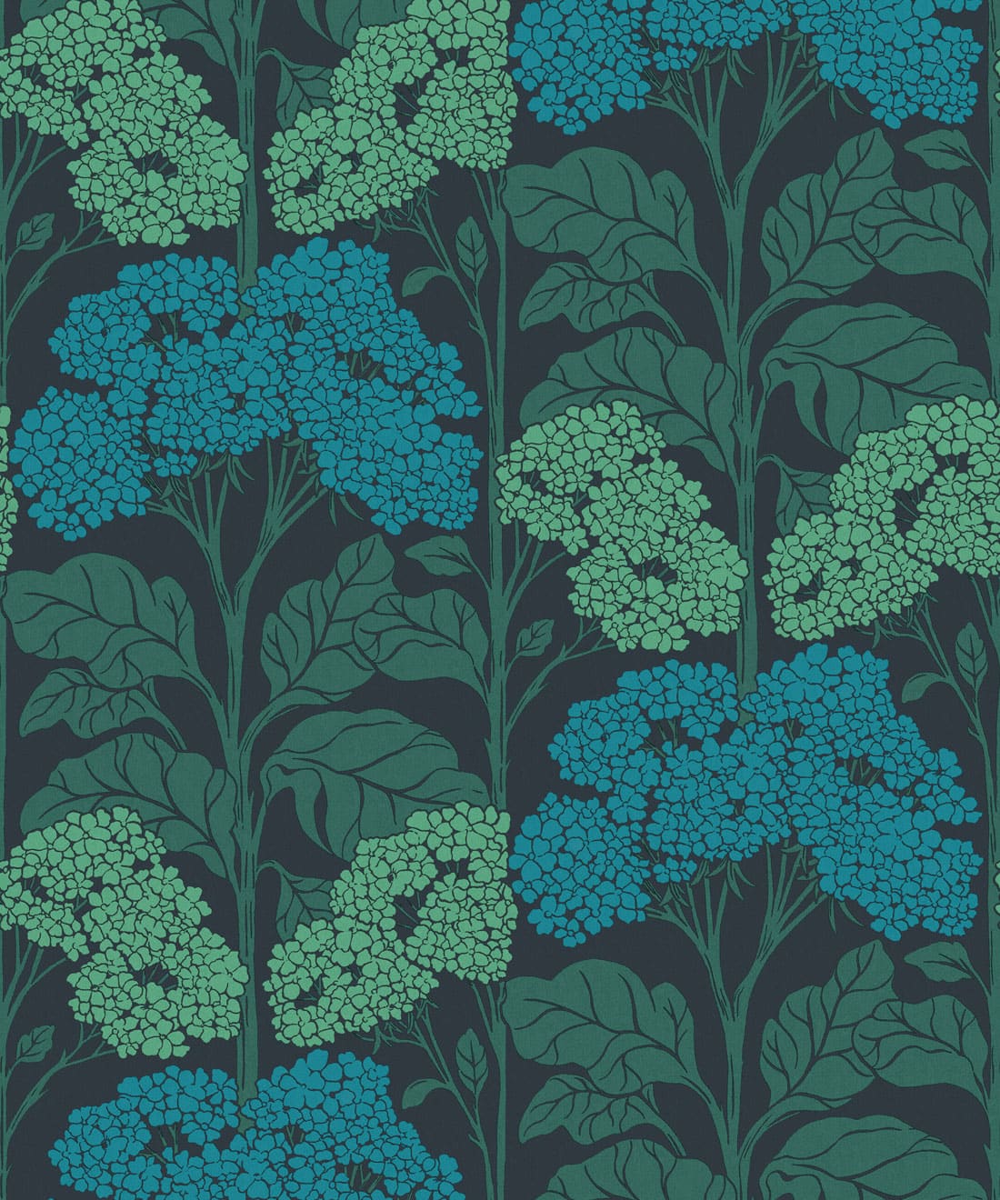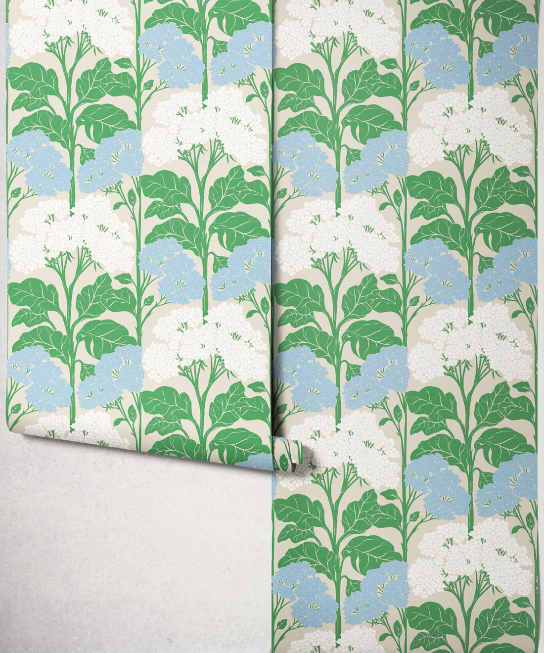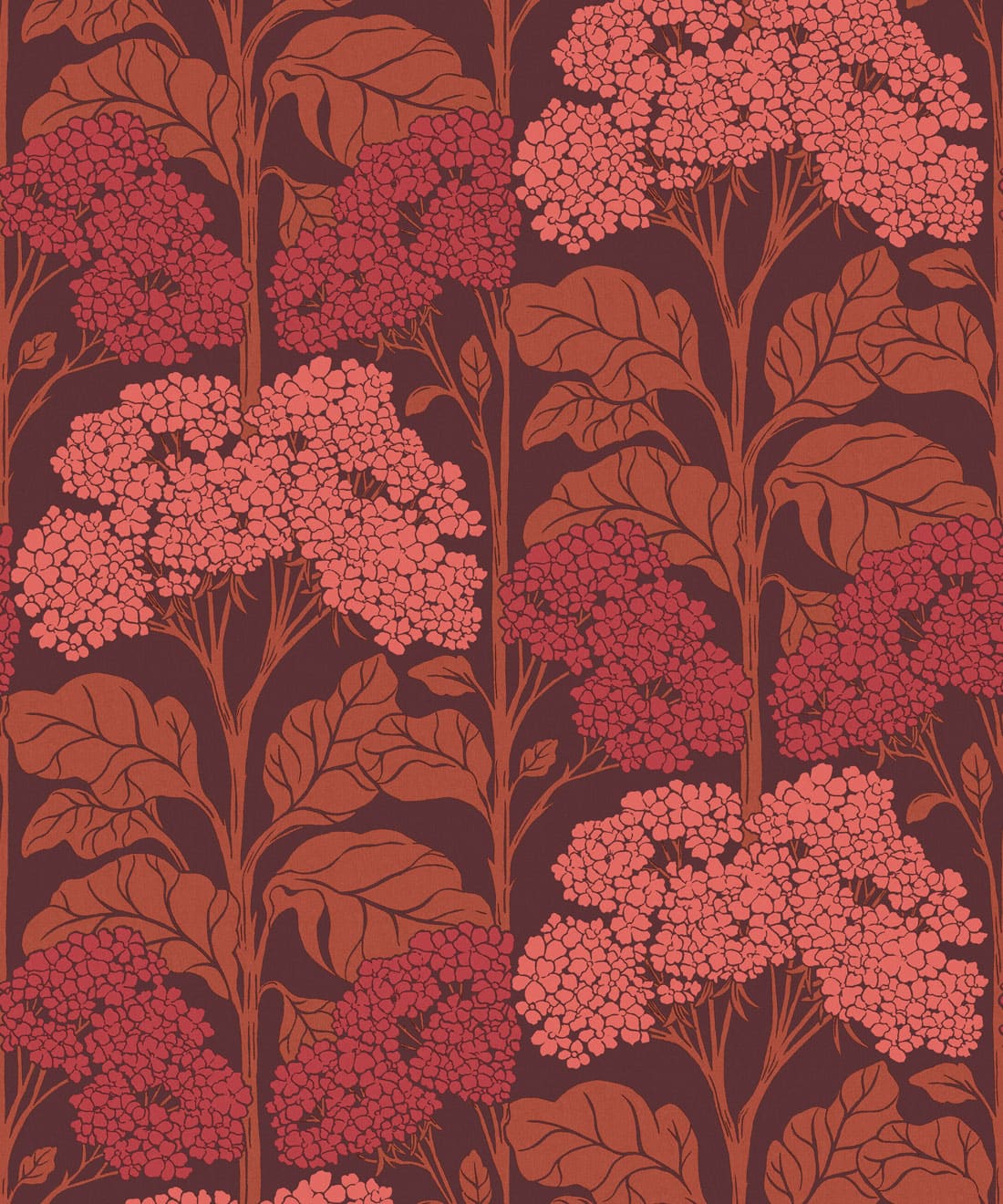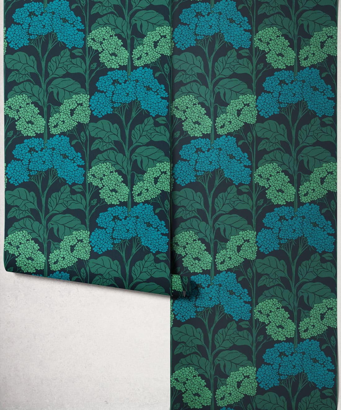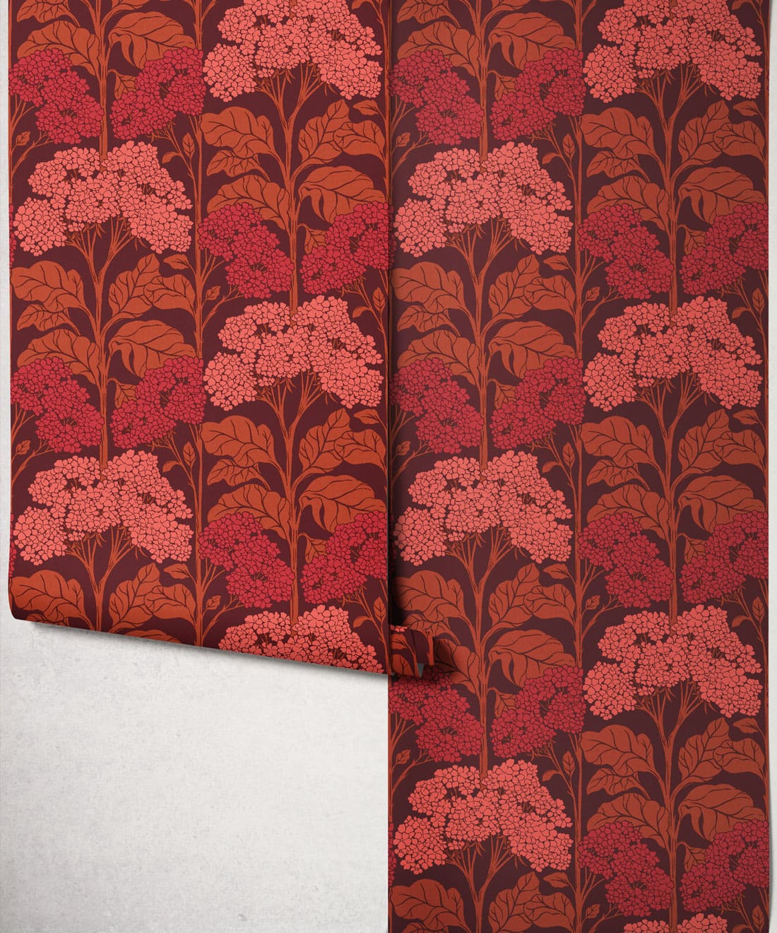 Influenced by Art Nouveau composition, the pattern balances organic form with graphic structure. Flat colour treatments and bright retro colourways bring playful nostalgia and a lighthearted sense of charm to the wall.