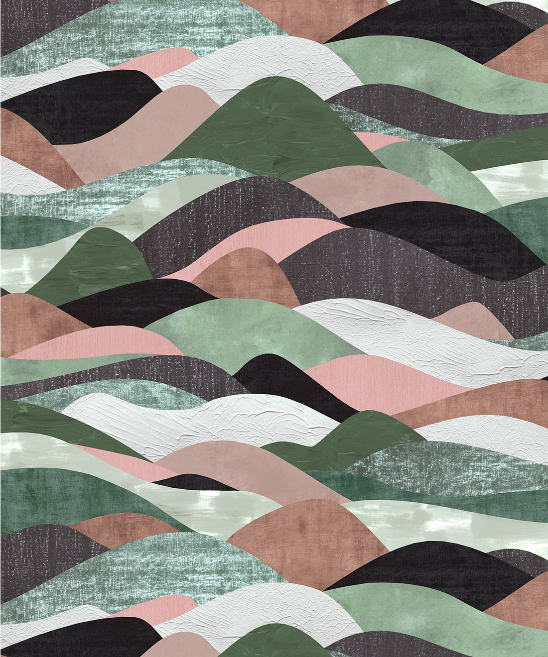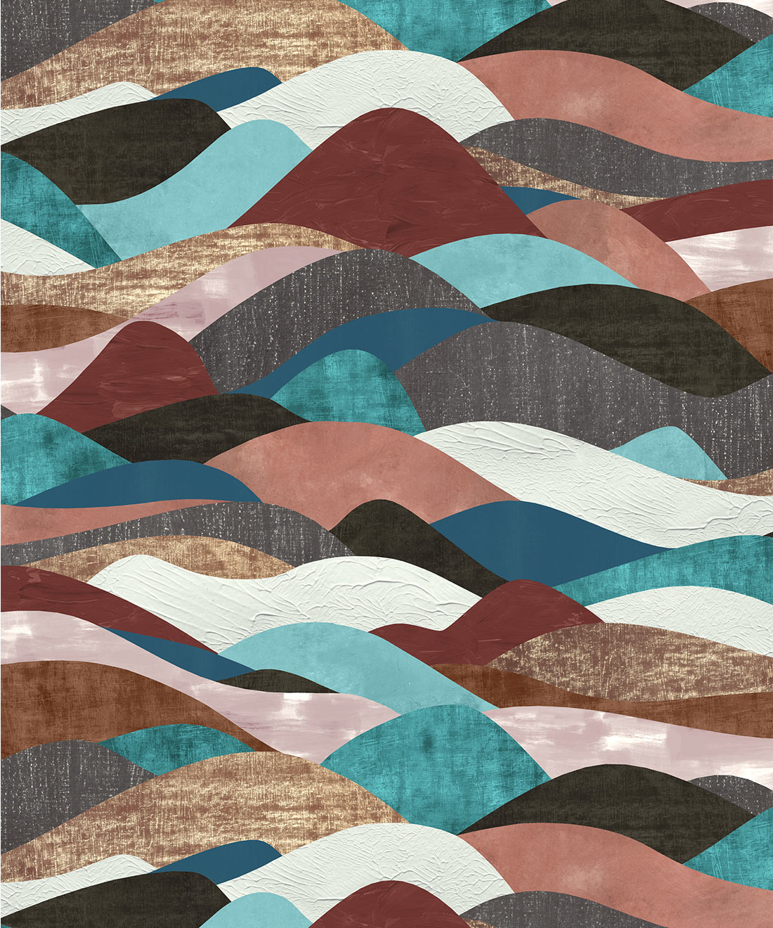 Dune is a layered visual journey through painted terrain, where soft rolling forms rise and fall like desert hills or wind-sculpted landscapes. Each shape is rendered using a variety of application techniques, from criss-crossed brushwork, to paint dabs, and denim-like weaves, giving each ‘dune’ its own unique surface and character.
