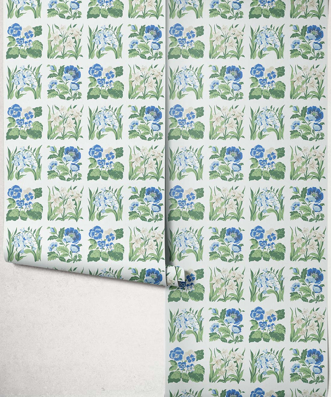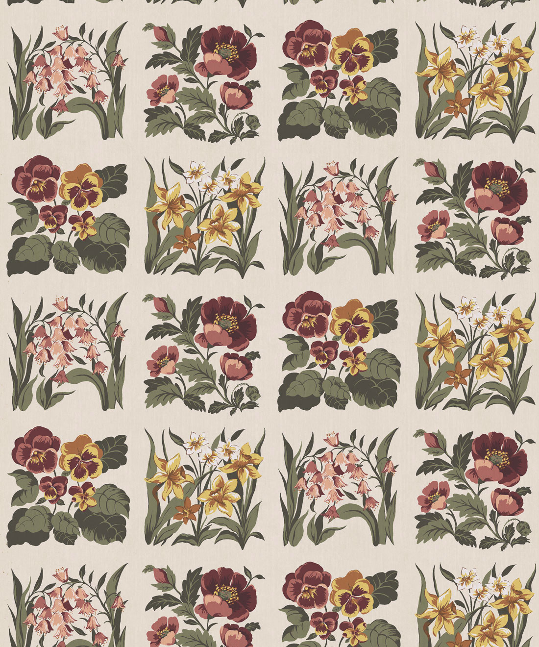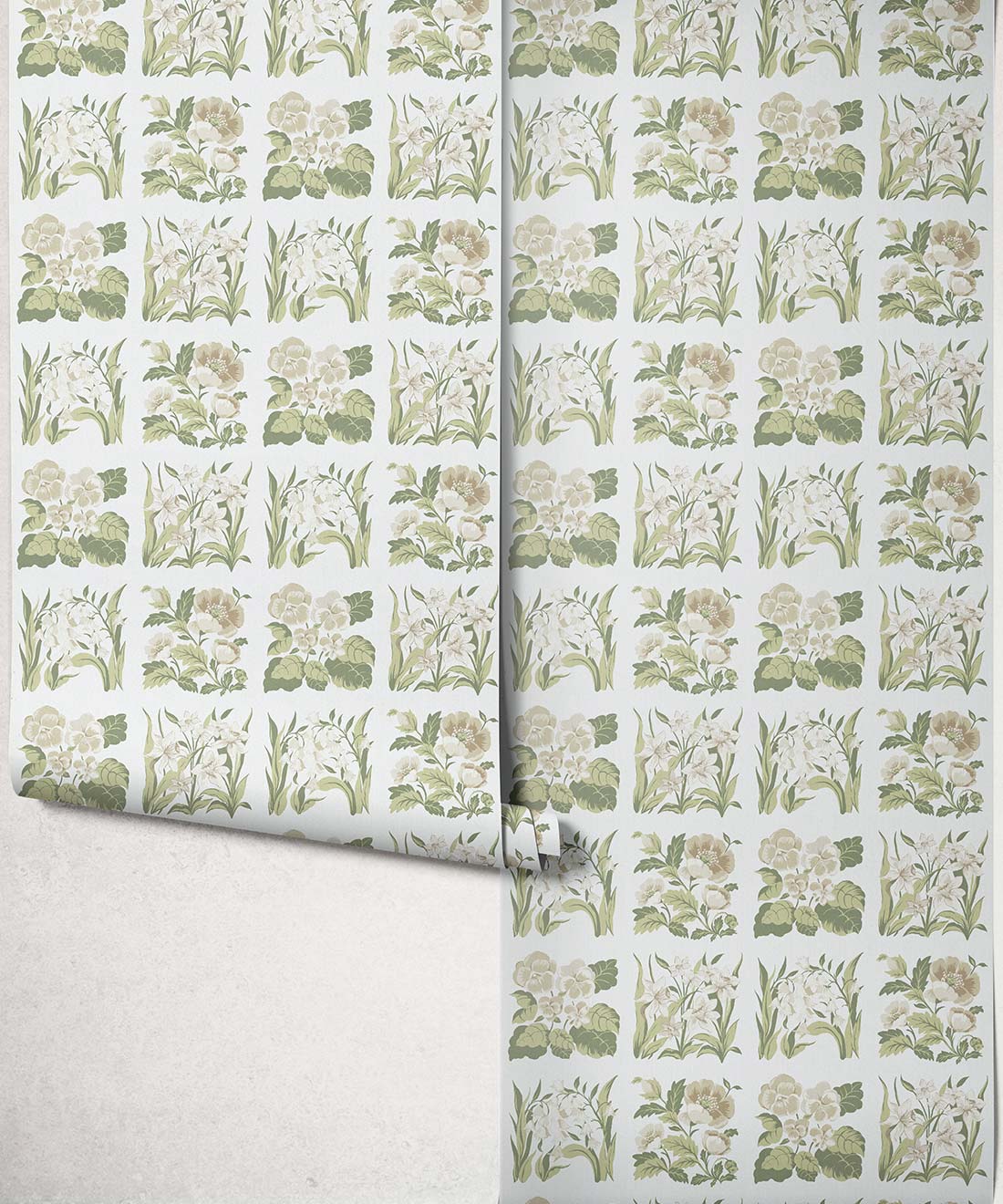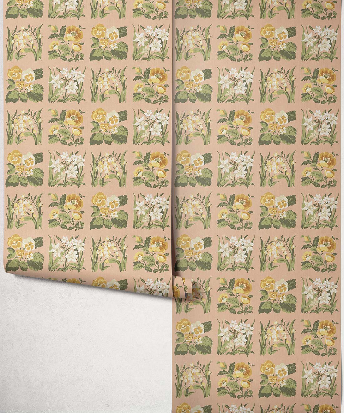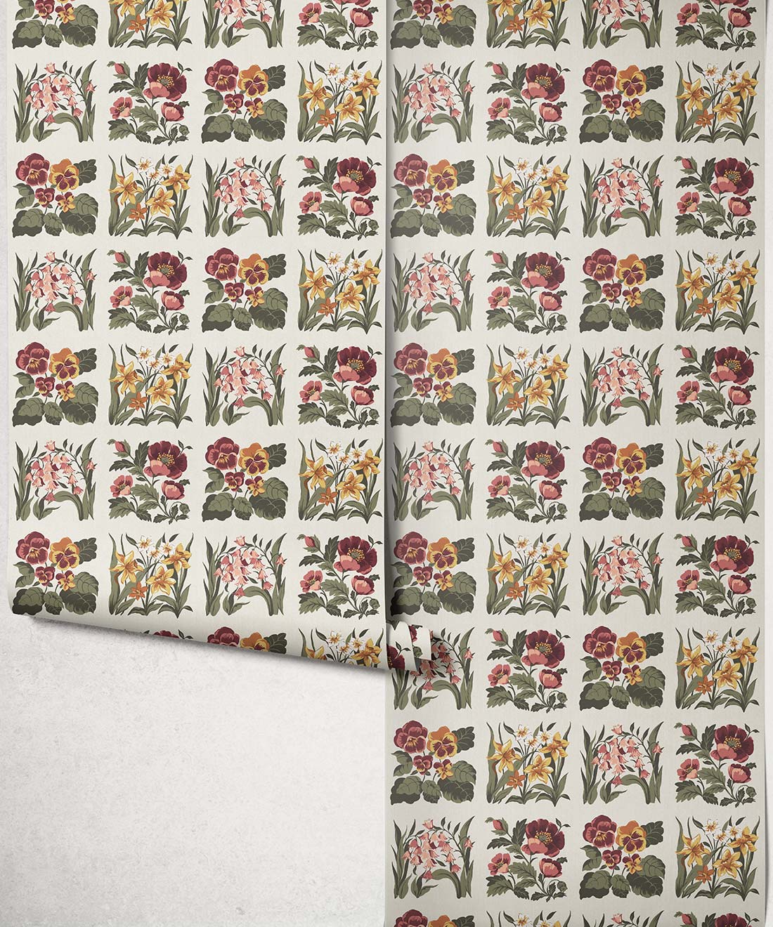Flower Patch Decorative Textile Wallpaper is a vintage inspired floral wallpaper featuring delicately drawn wildflowers arranged in neat squares like garden tiles. The pattern creates a subtle checked layout across the wall, bringing botanical charm and gentle structure to the design.