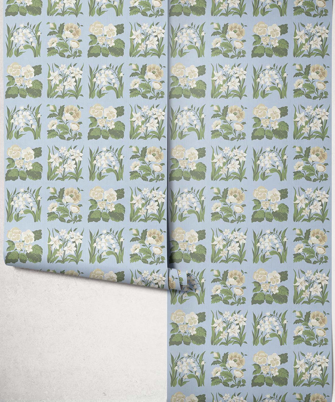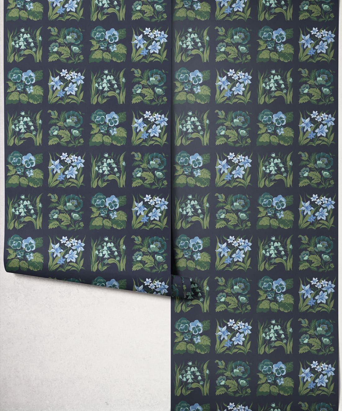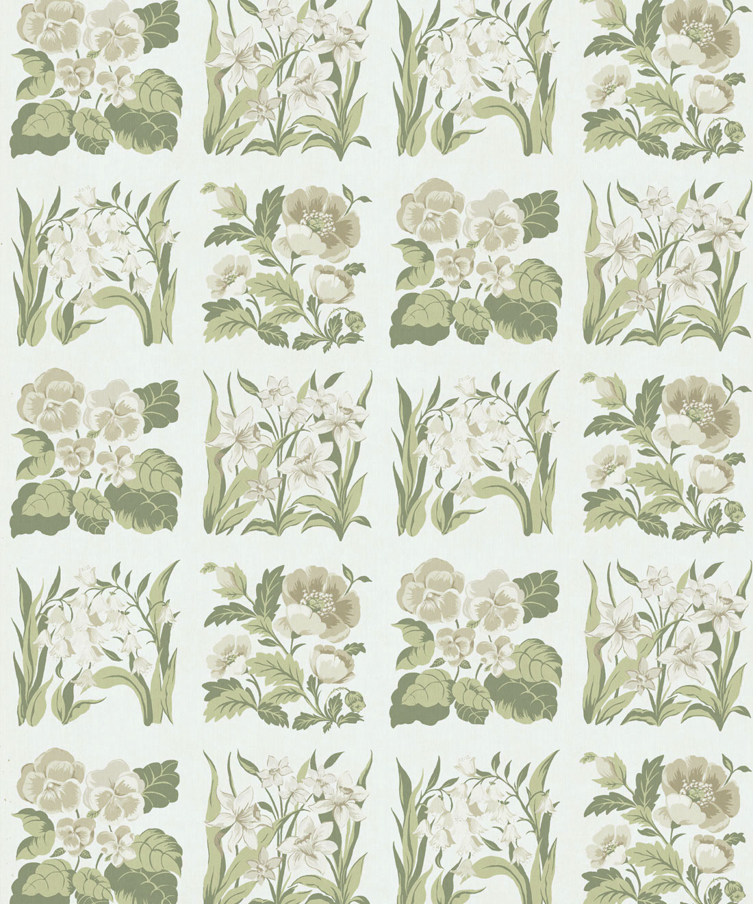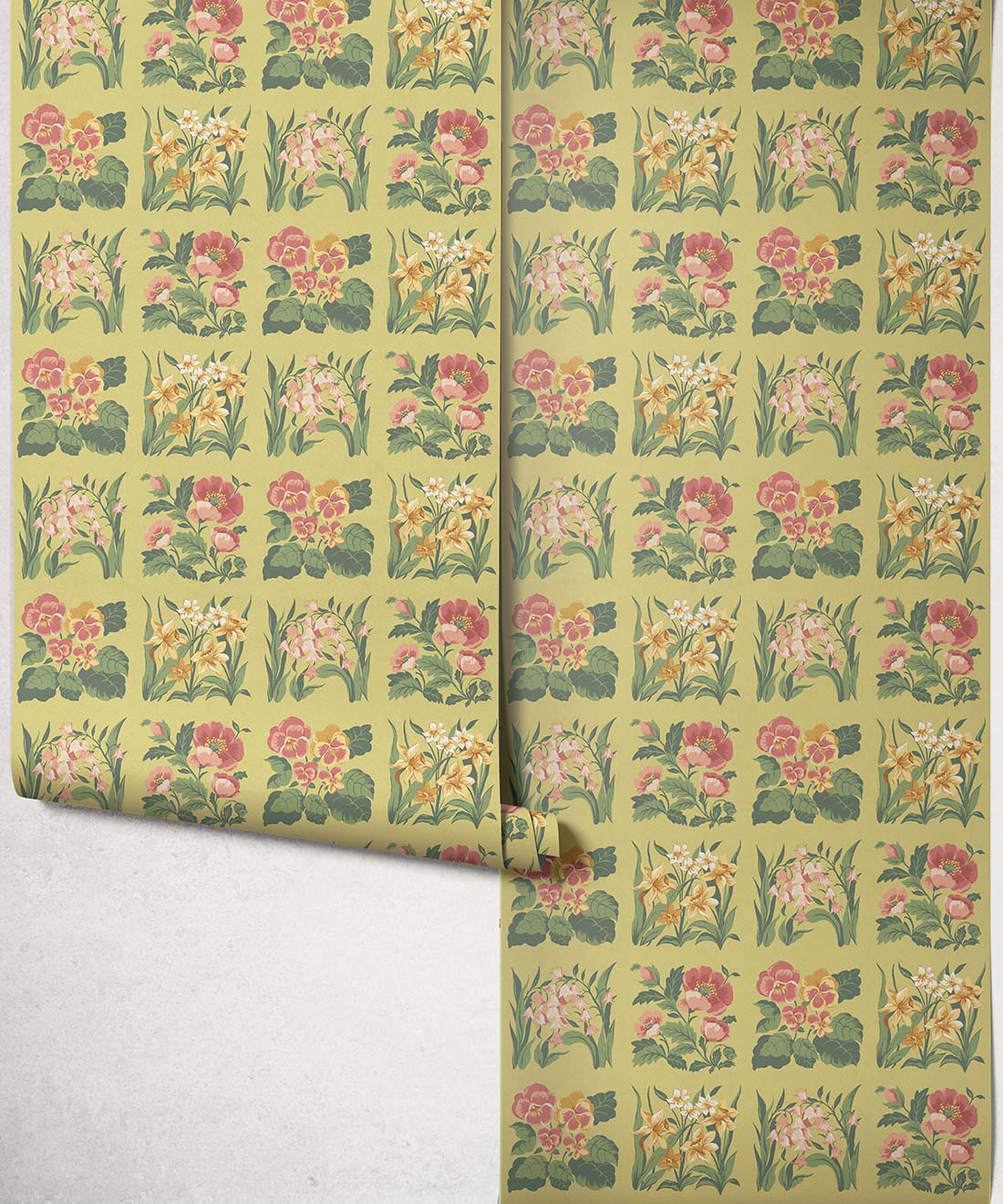 Flower Patch Decorative Textile Wallpaper is a vintage inspired floral wallpaper featuring delicately drawn wildflowers arranged in neat squares like garden tiles. The pattern creates a subtle checked layout across the wall, bringing botanical charm and gentle structure to the design.