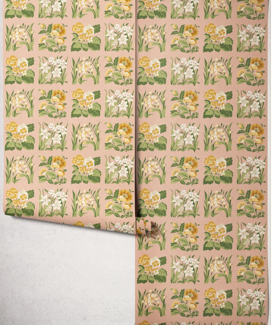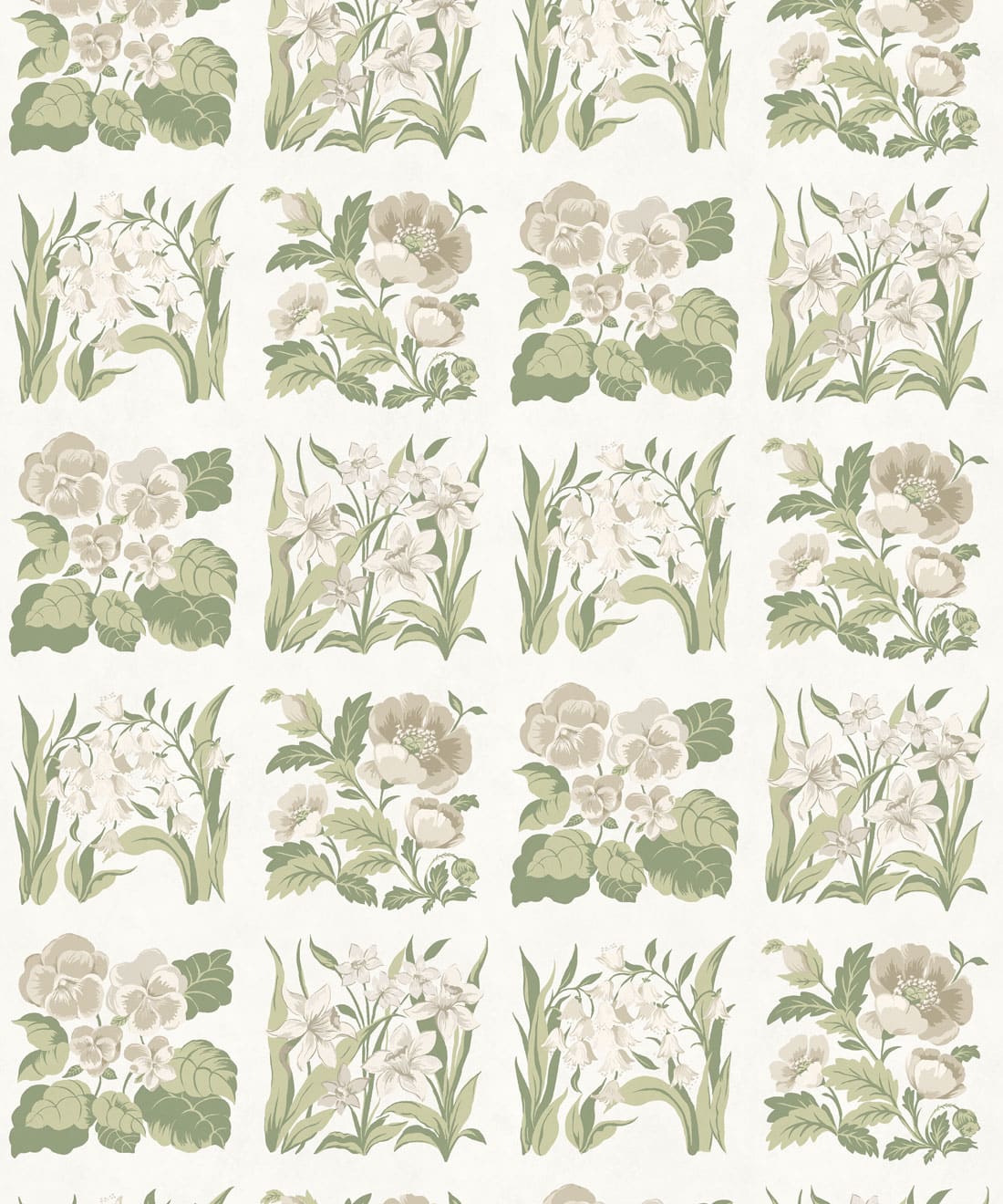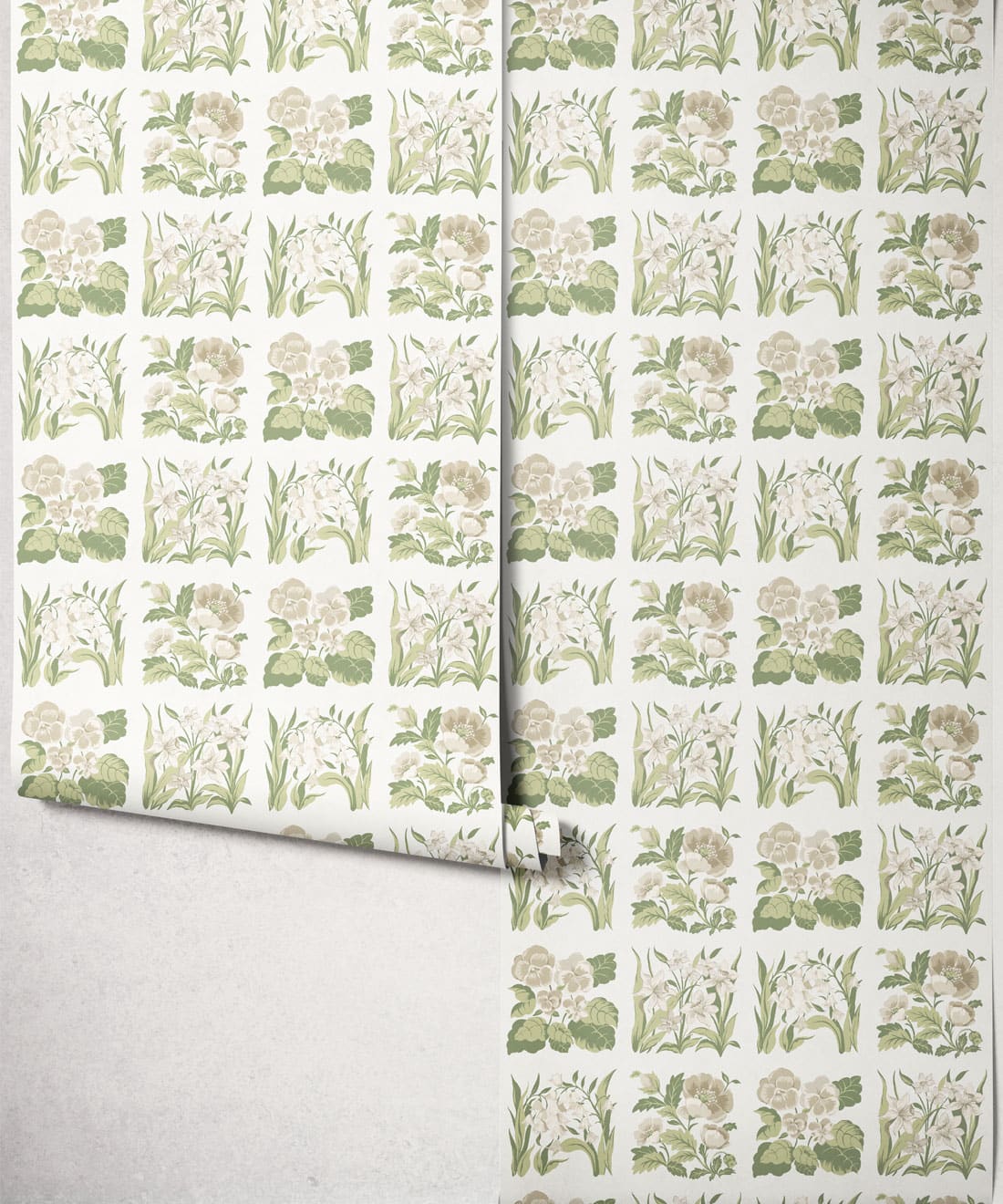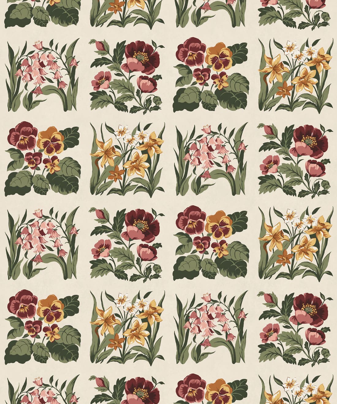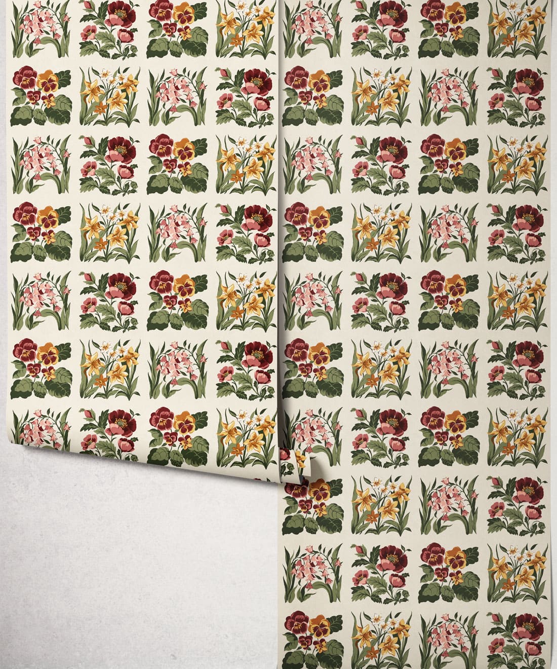 Flower Patch is a vintage inspired floral wallpaper featuring delicately drawn wildflowers arranged in neat squares like garden tiles. The pattern creates a subtle checked layout across the wall, bringing botanical charm and gentle structure to the design.