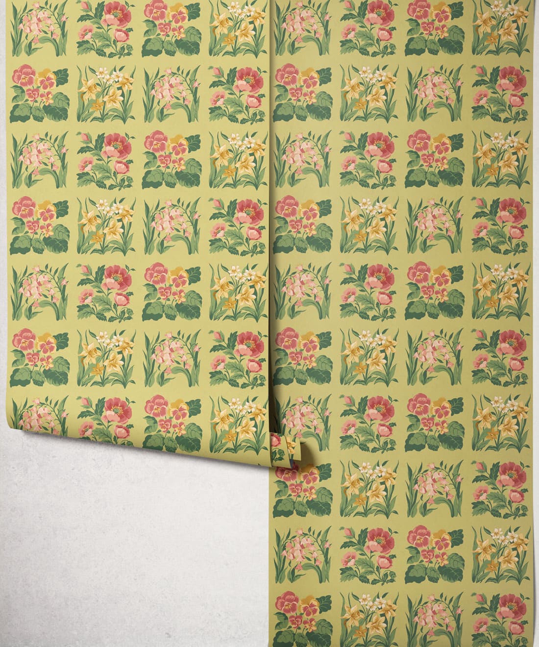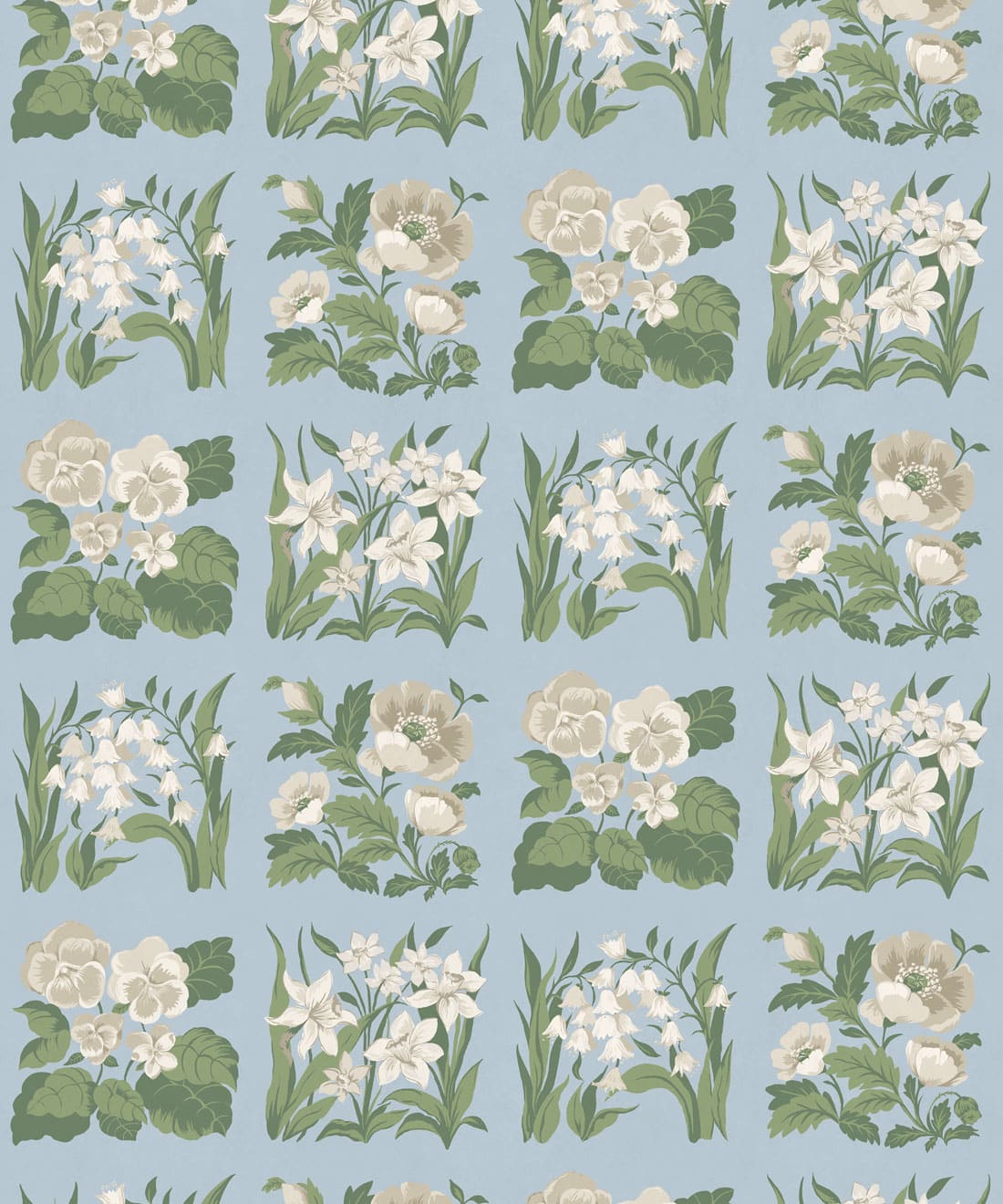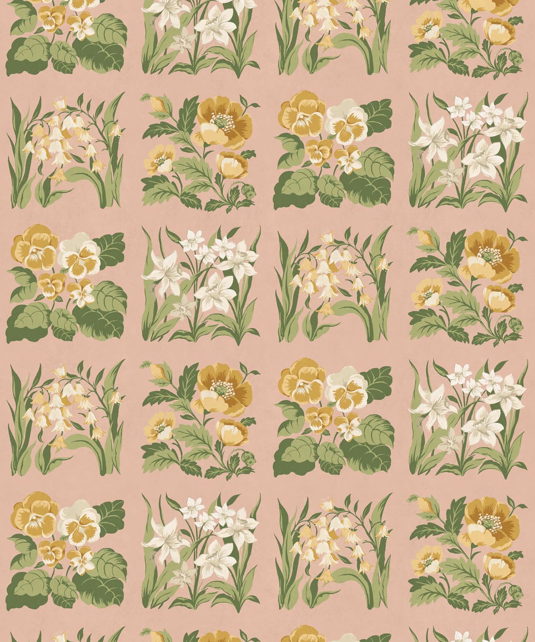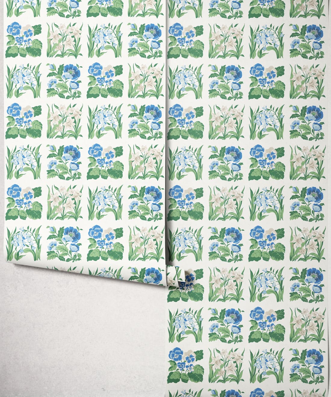 Flower Patch is a vintage inspired floral wallpaper featuring delicately drawn wildflowers arranged in neat squares like garden tiles. The pattern creates a subtle checked layout across the wall, bringing botanical charm and gentle structure to the design.