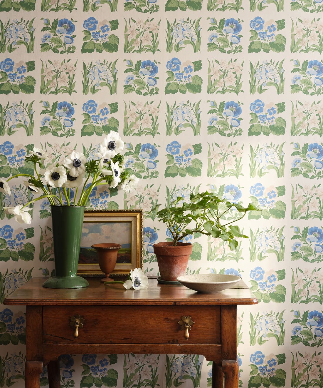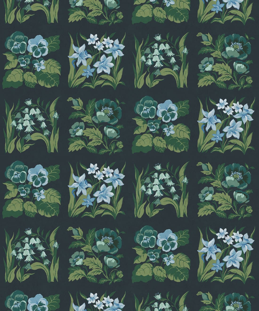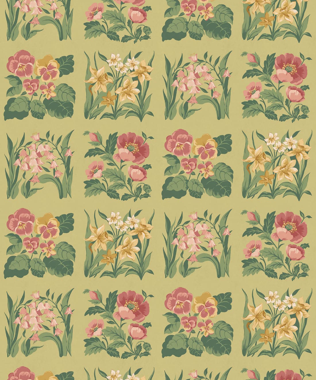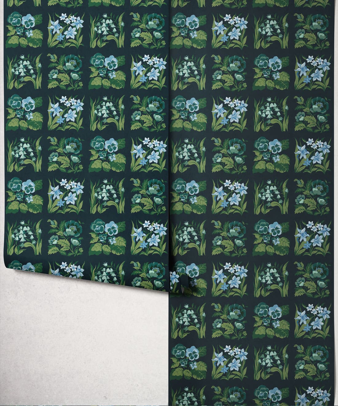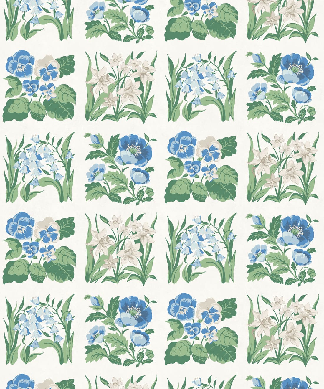 Flower Patch is a vintage inspired floral wallpaper featuring delicately drawn wildflowers arranged in neat squares like garden tiles. The pattern creates a subtle checked layout across the wall, bringing botanical charm and gentle structure to the design.