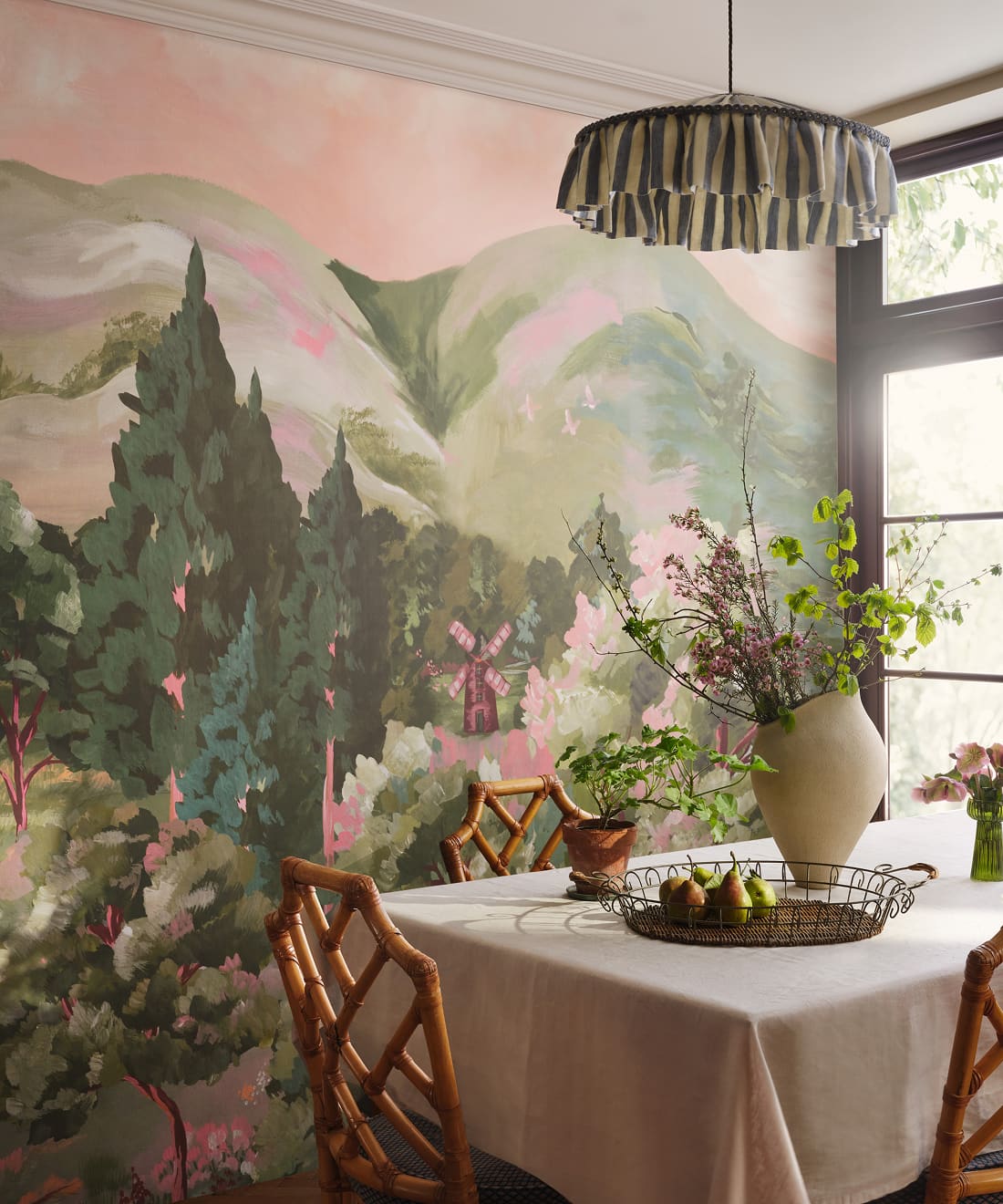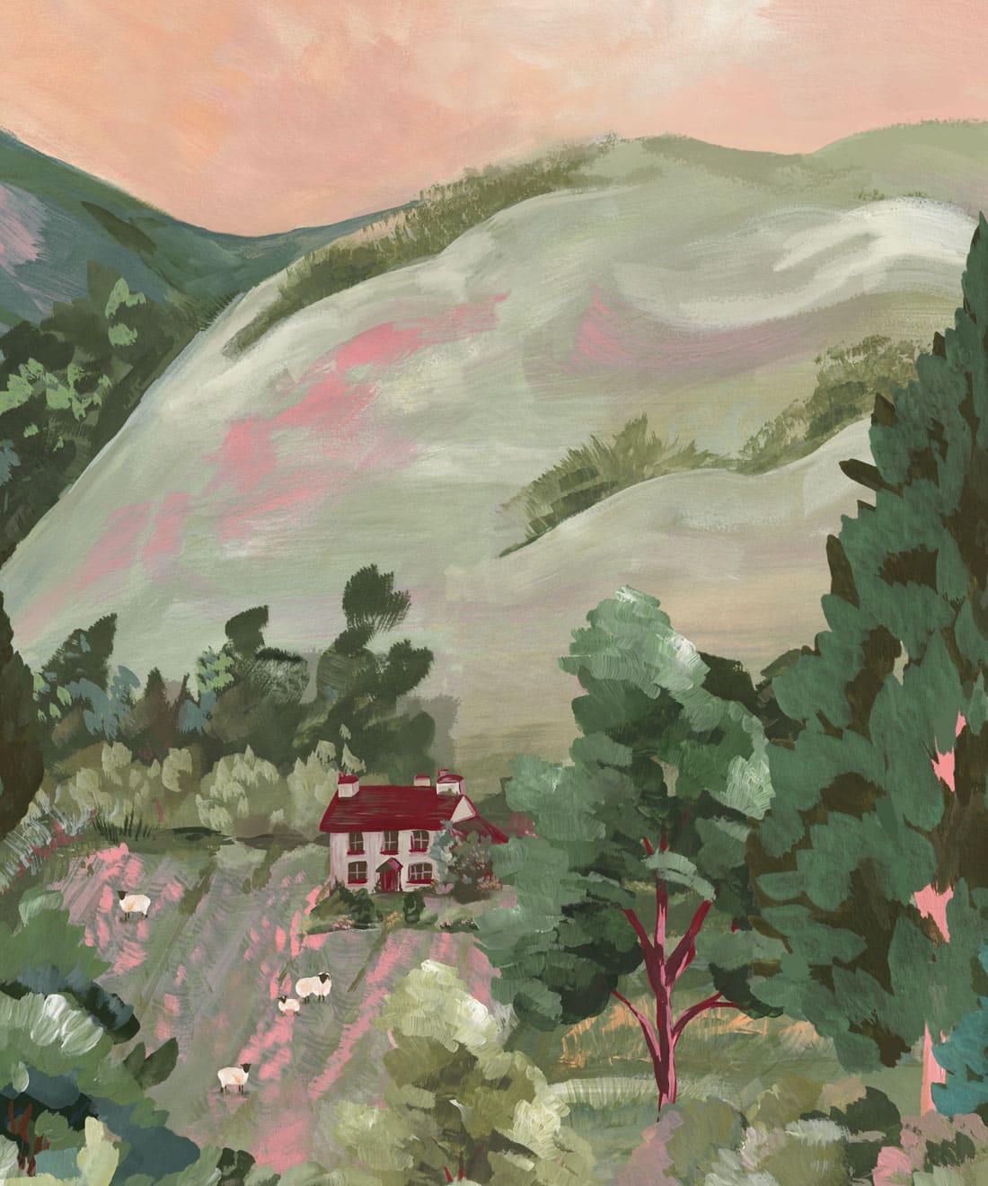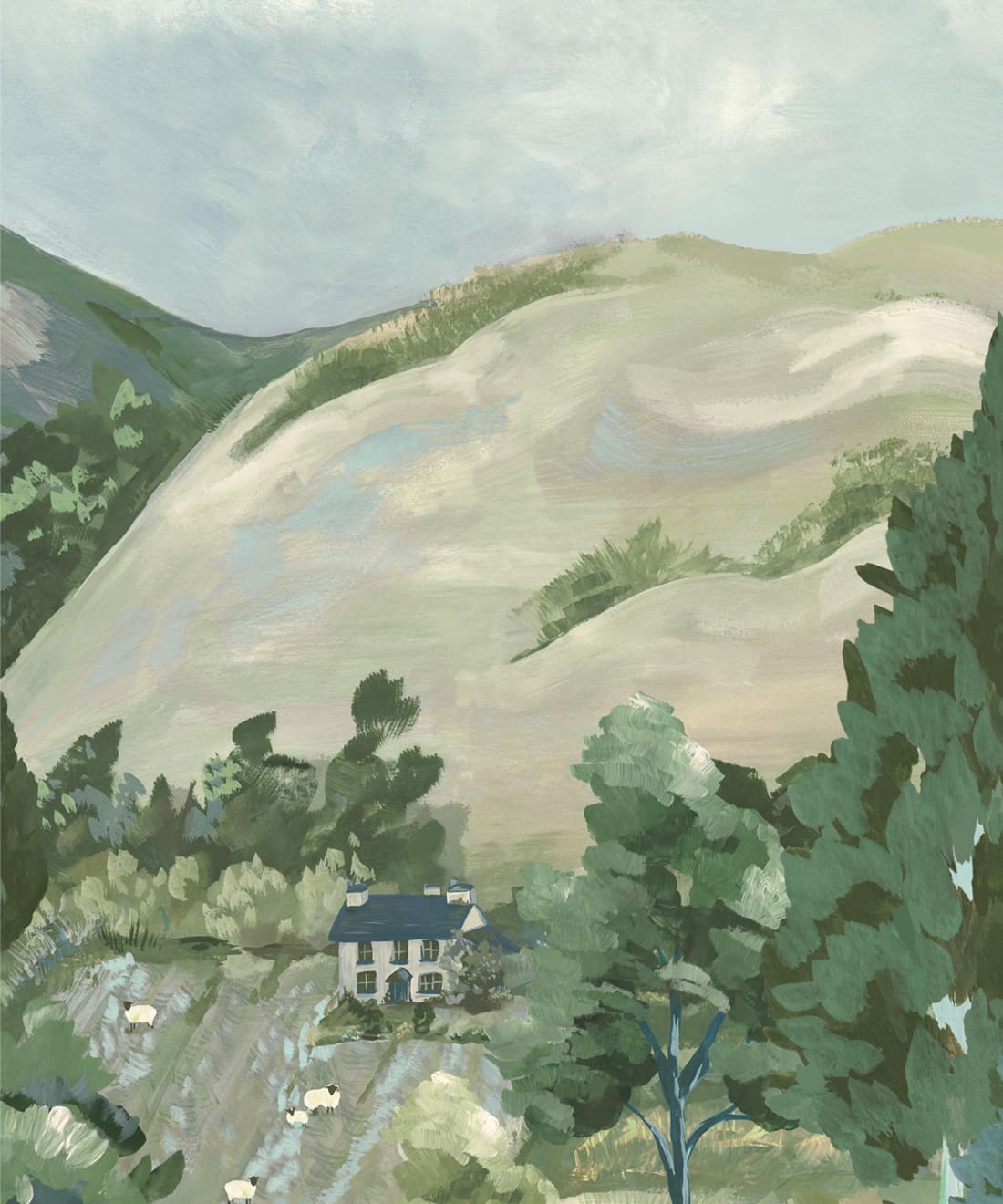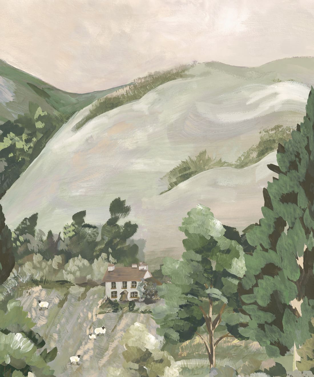 Impasto Meadows is a painterly mural wallpaper inspired by Impressionist landscape painting and the nostalgic beauty of rolling countryside scenes. Sweeping brushstrokes of colour build layers of hills, trees and sky, creating a richly textured composition across the wall.