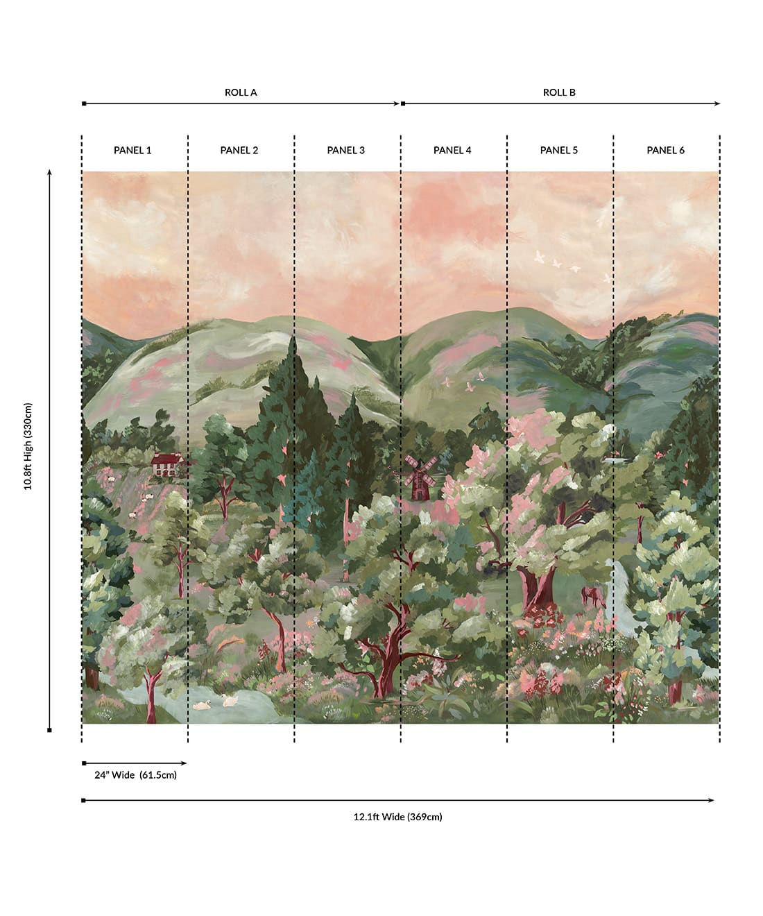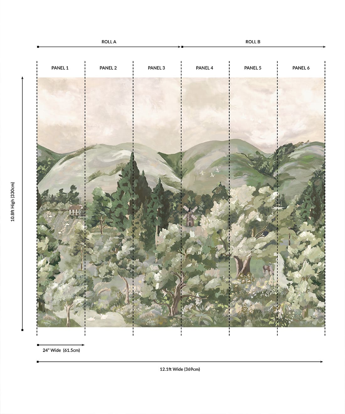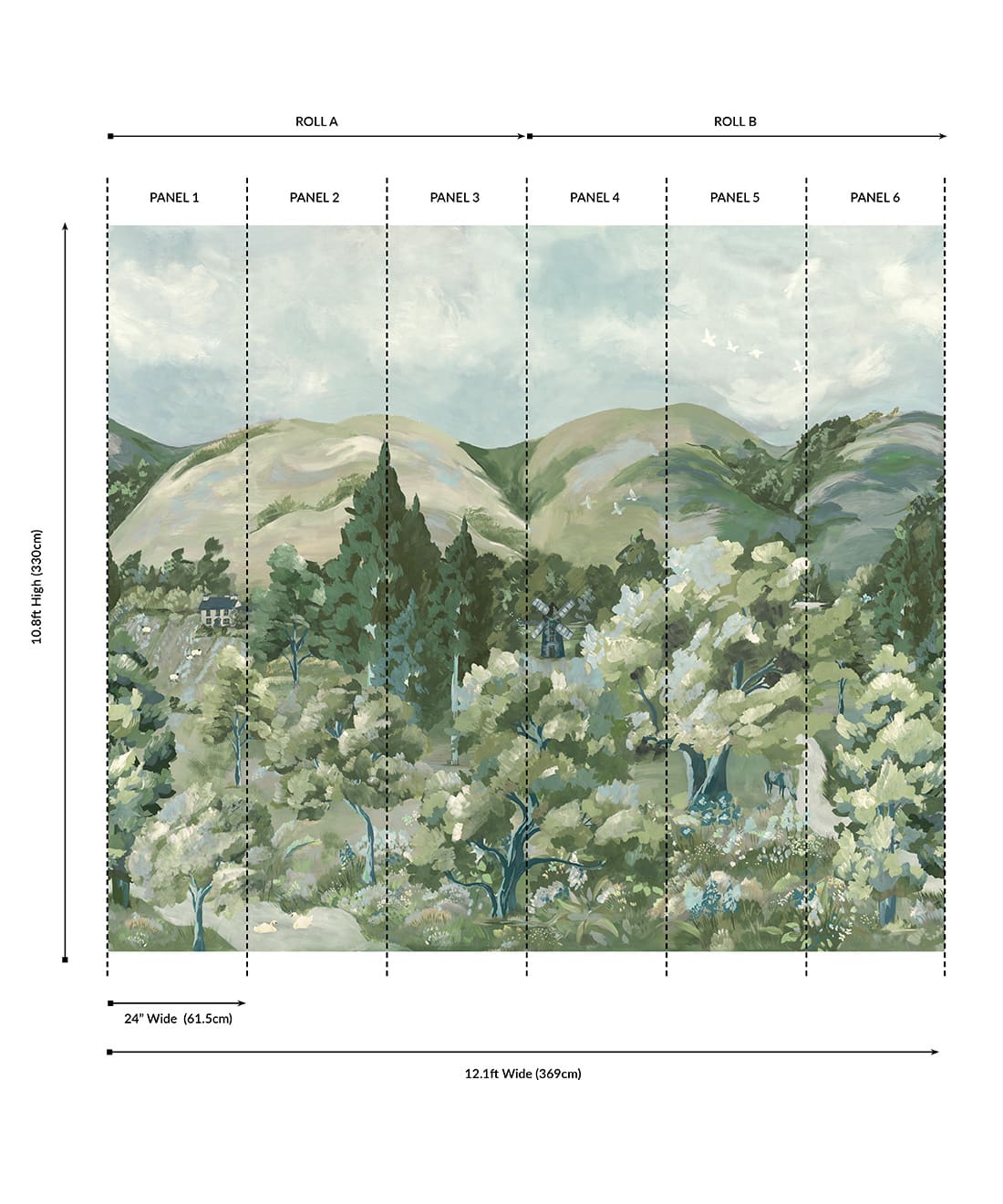 This mural comes as a two roll set (ROLL A & B). Each roll comes with 3 panels. The horizontal pattern will repeat every 2 panels. Install all of ROLL A, followed by all of ROLL B.
