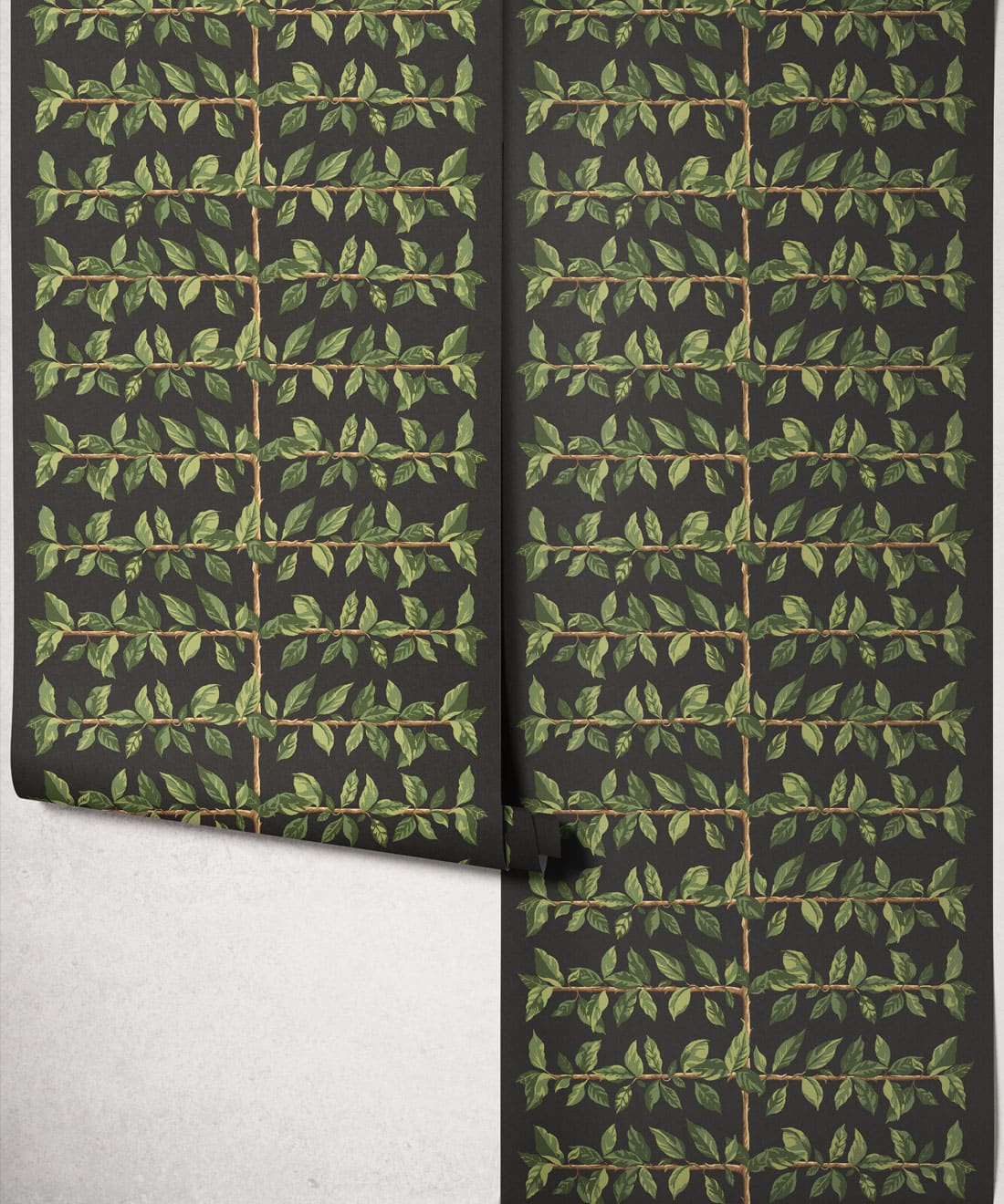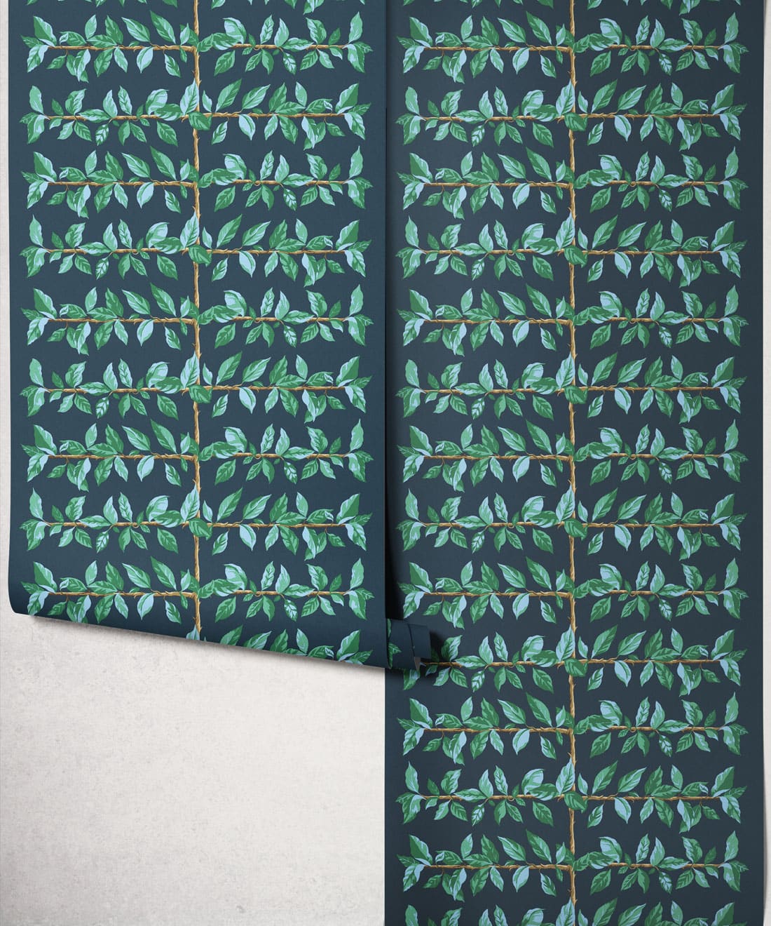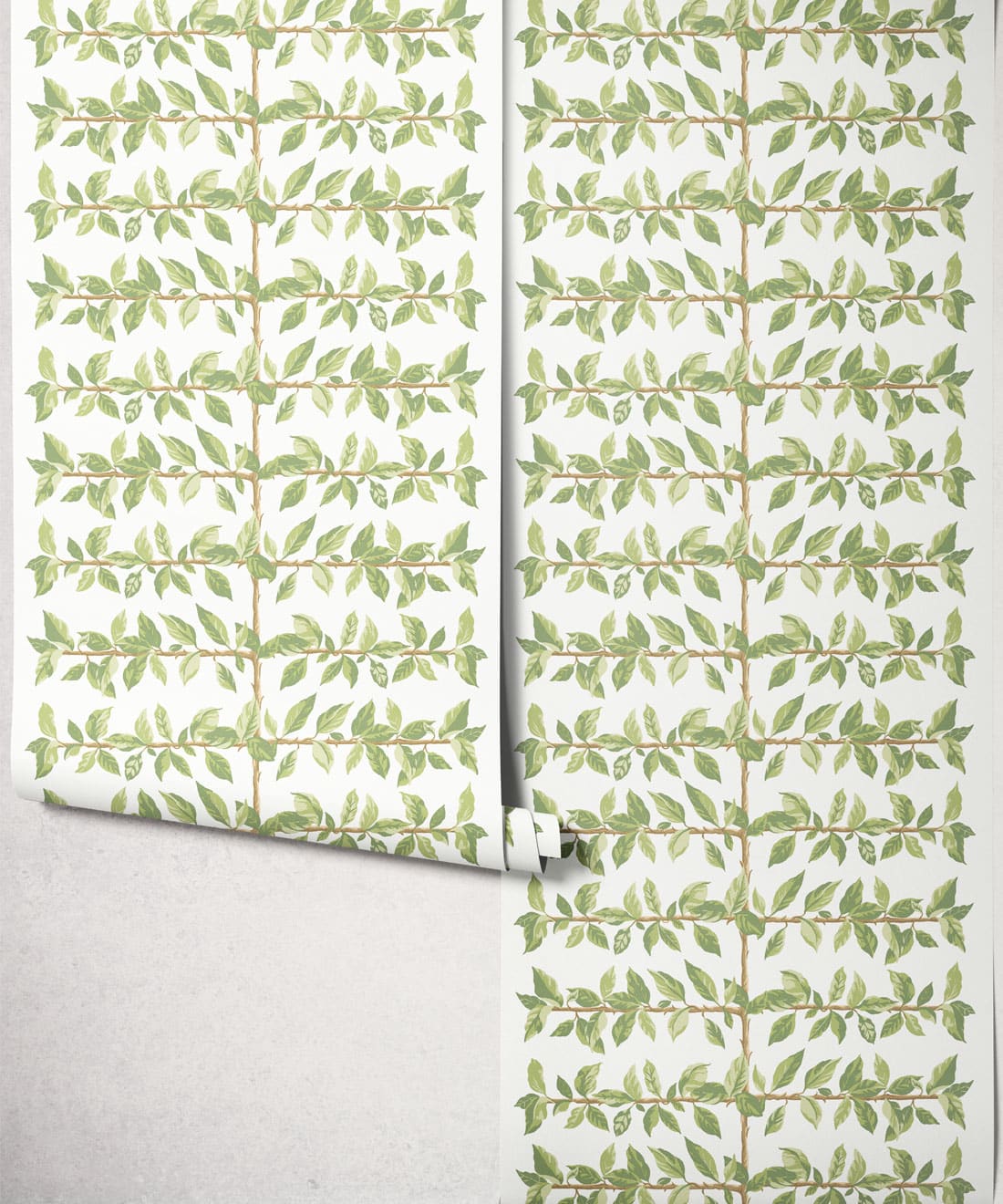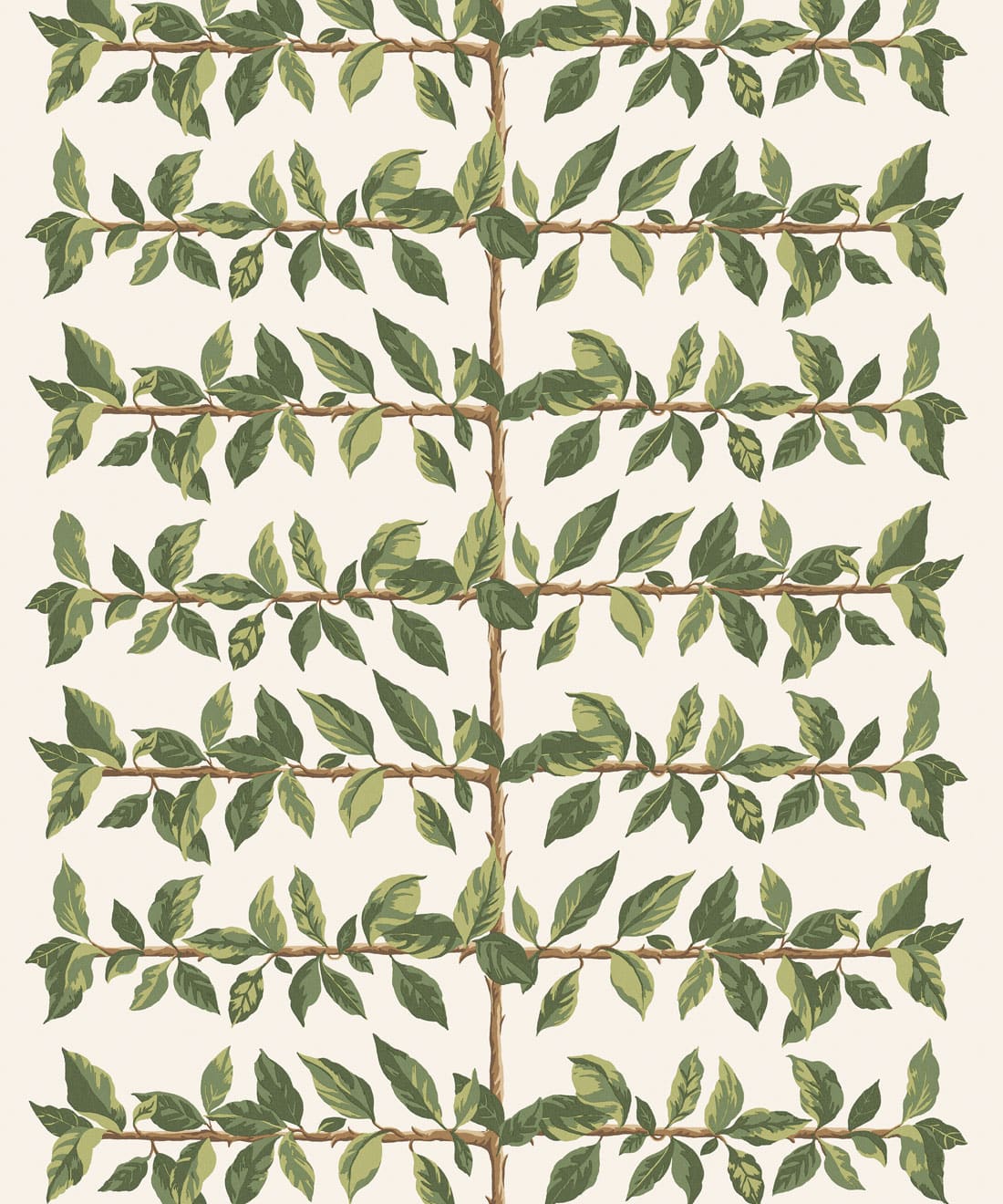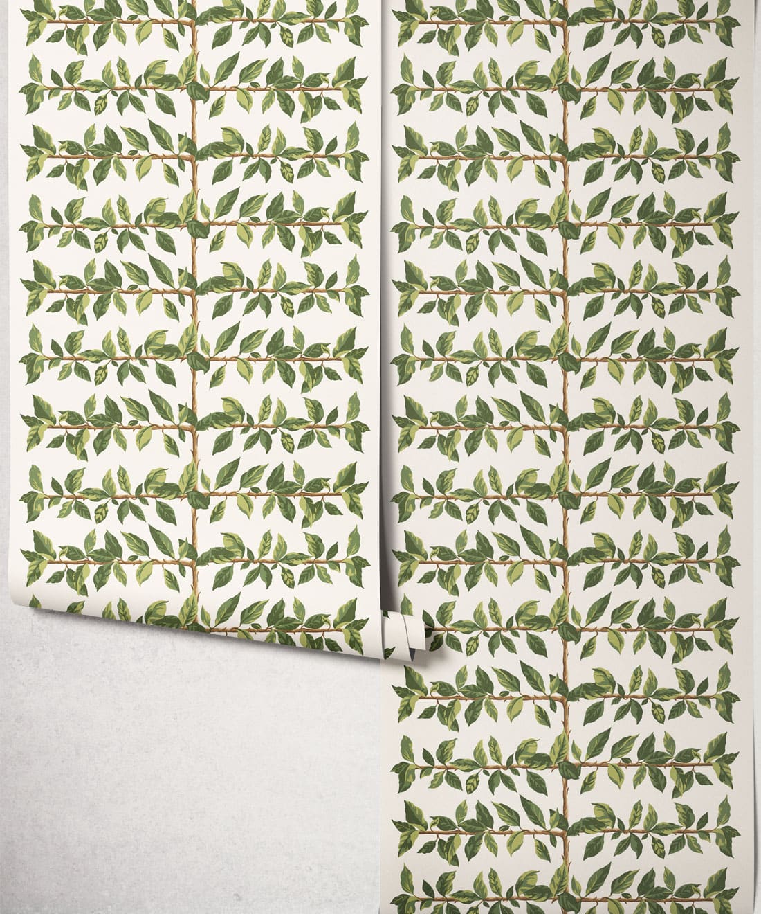 Pergola is a large scale foliage stripe wallpaper inspired by the climbing greenery of garden trellises and pergolas. Leaves and stems rise vertically through the design, forming a pattern that reflects the structure of garden frameworks.