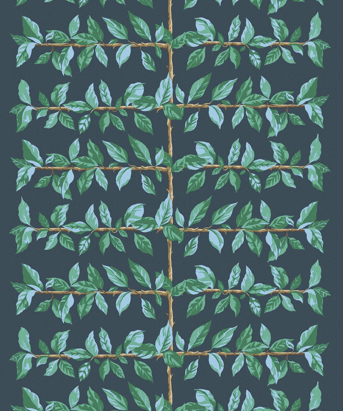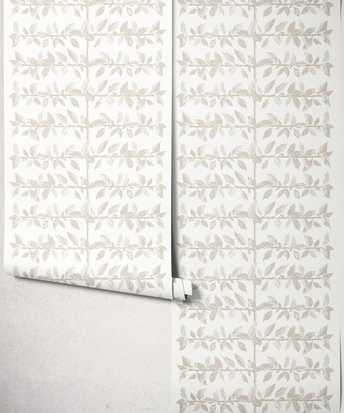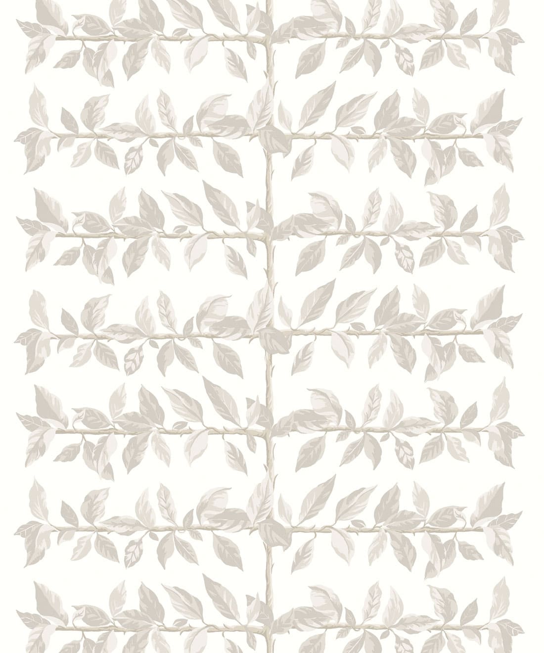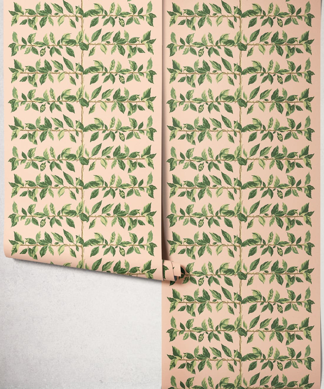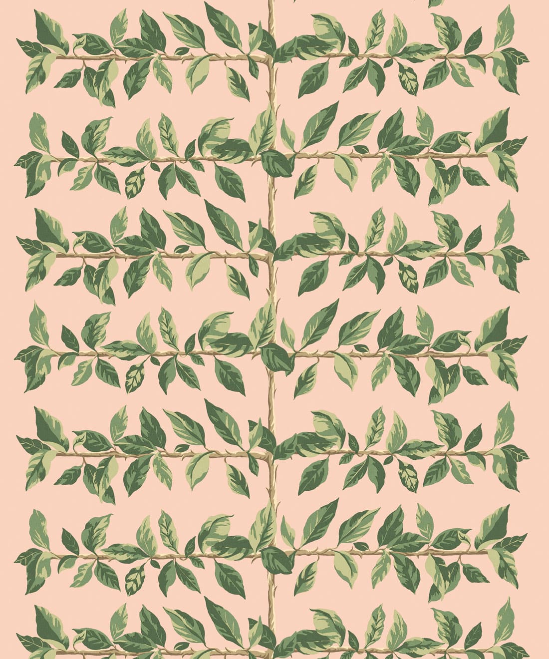 Pergola is a large scale foliage stripe wallpaper inspired by the climbing greenery of garden trellises and pergolas. Leaves and stems rise vertically through the design, forming a pattern that reflects the structure of garden frameworks.