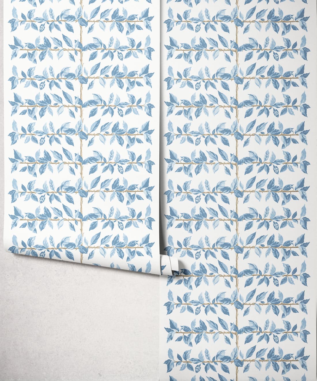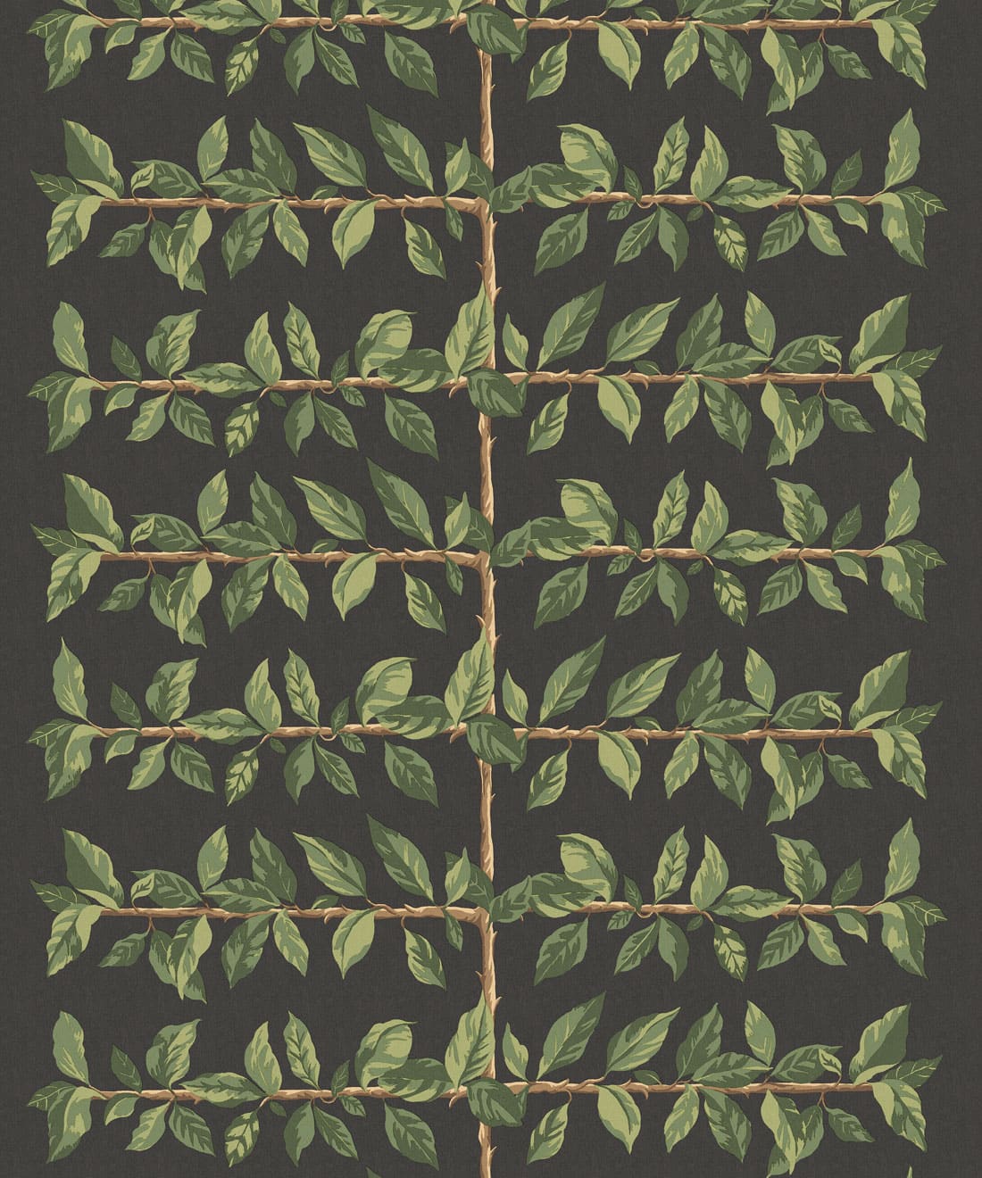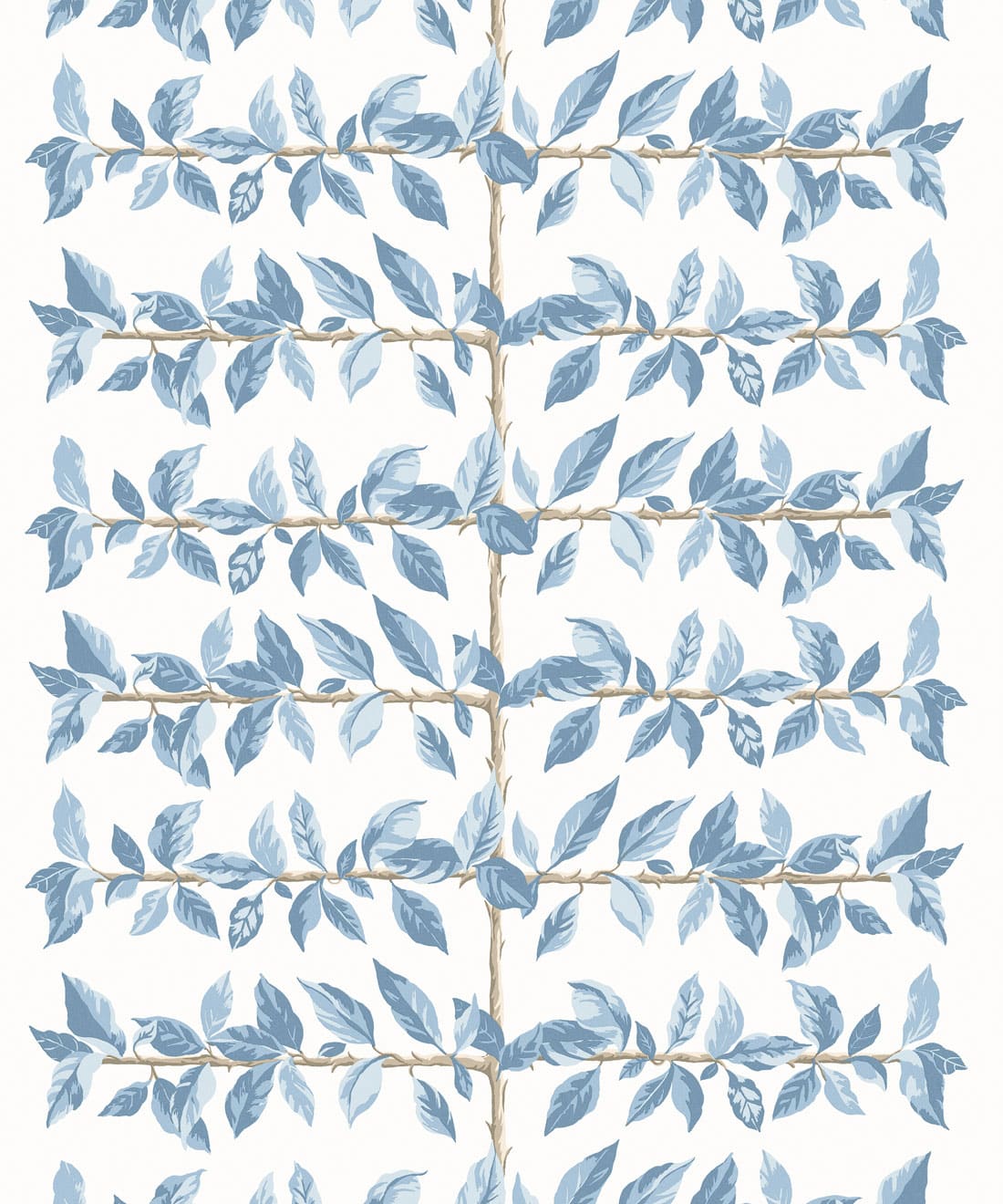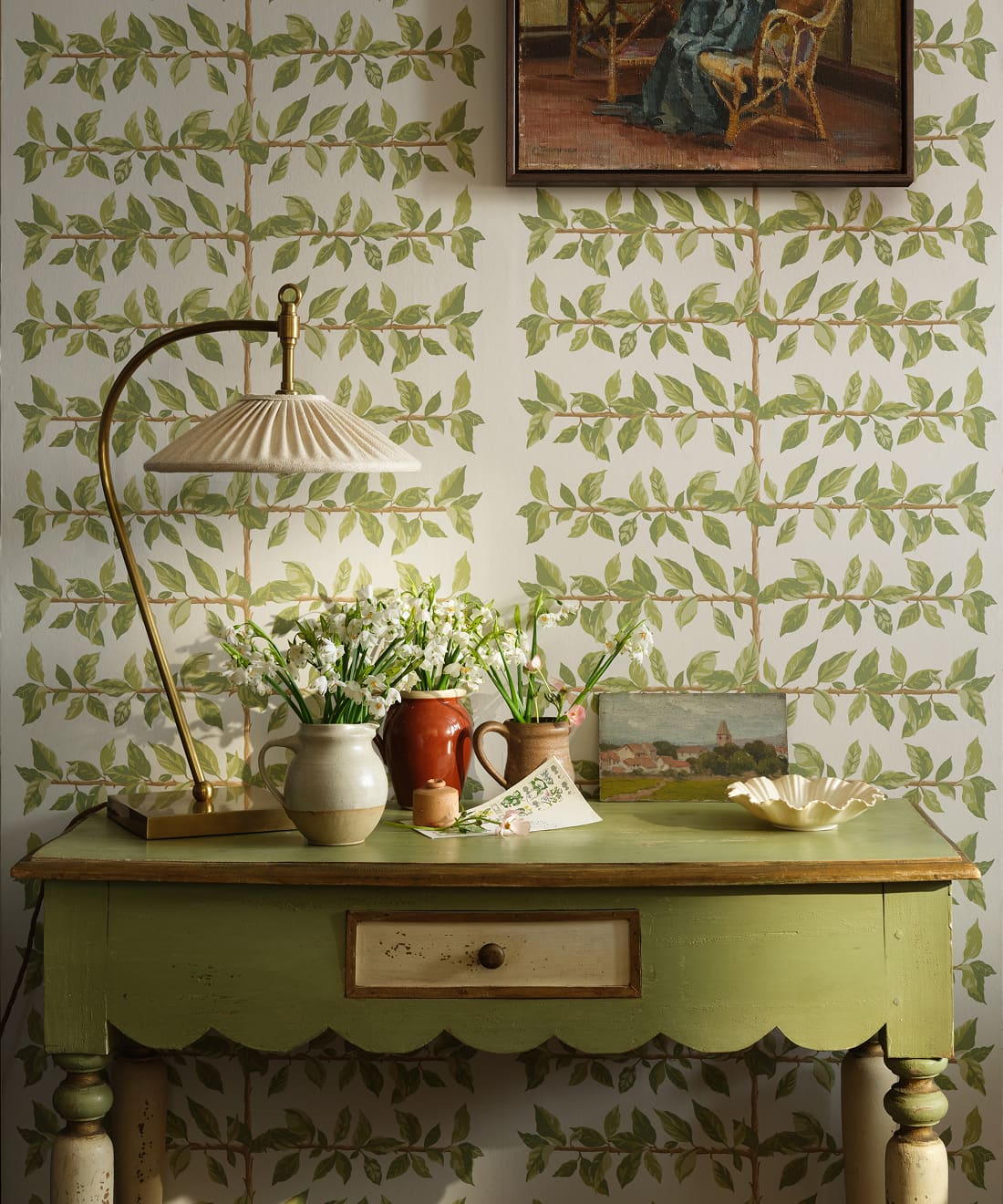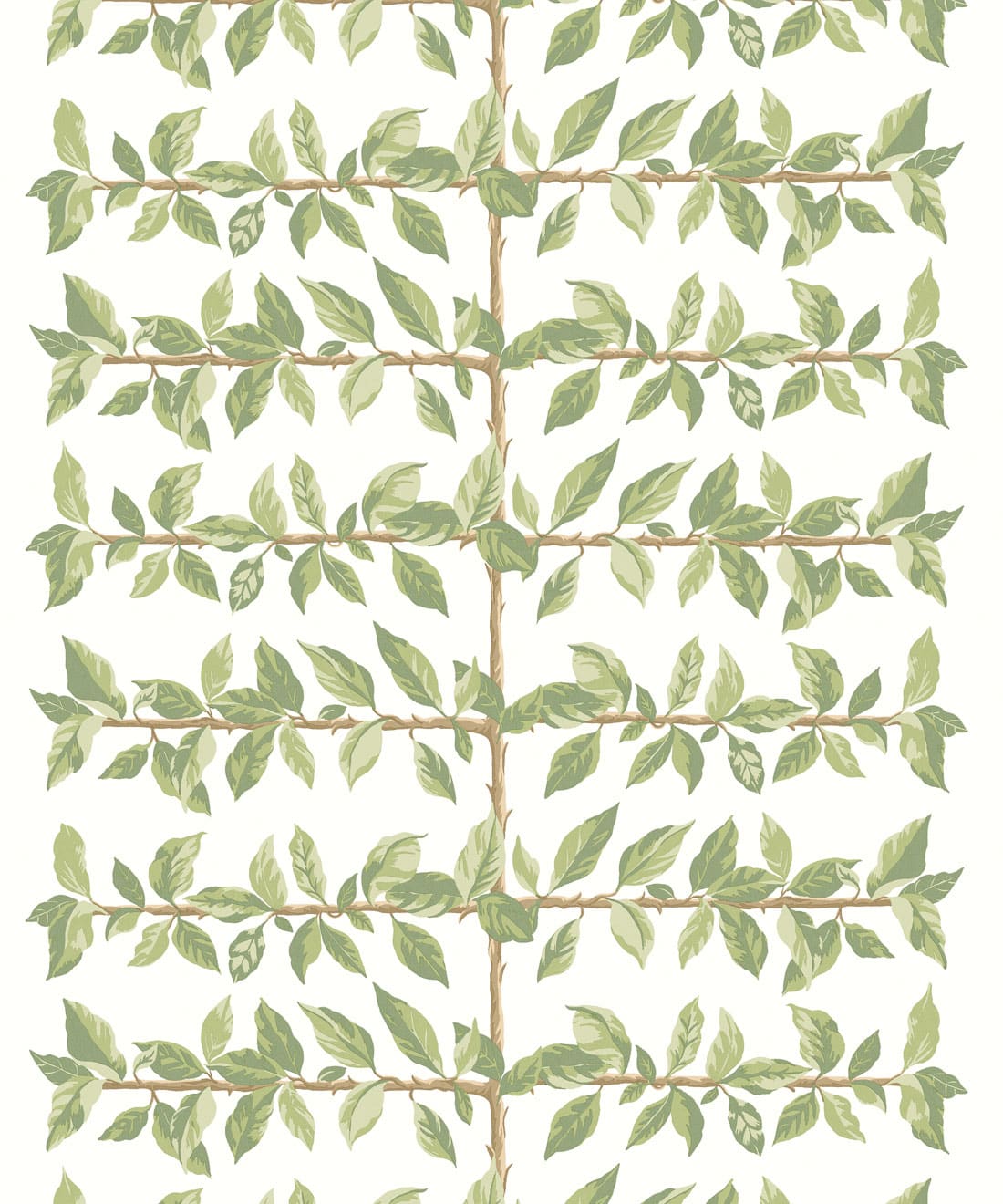 Pergola is a large scale foliage stripe wallpaper inspired by the climbing greenery of garden trellises and pergolas. Leaves and stems rise vertically through the design, forming a pattern that reflects the structure of garden frameworks.