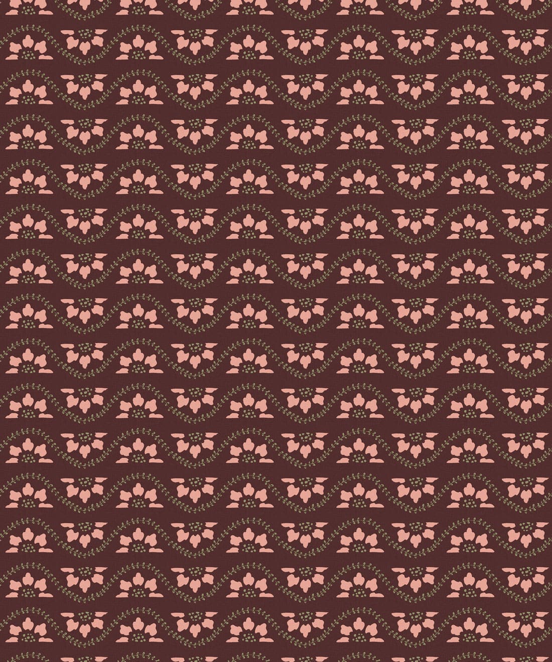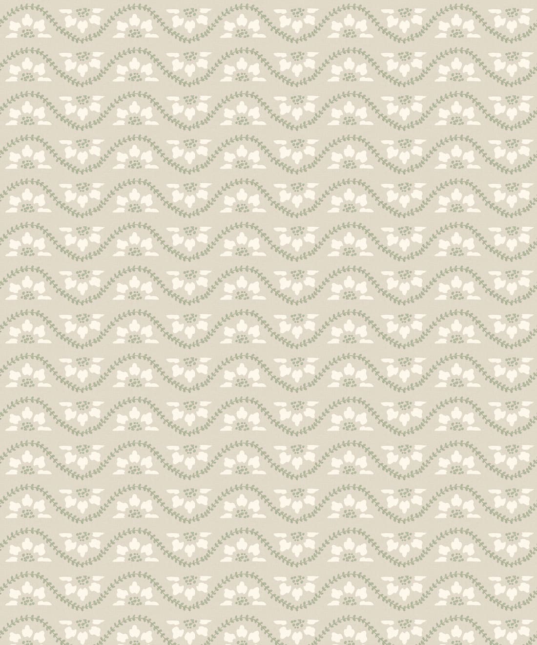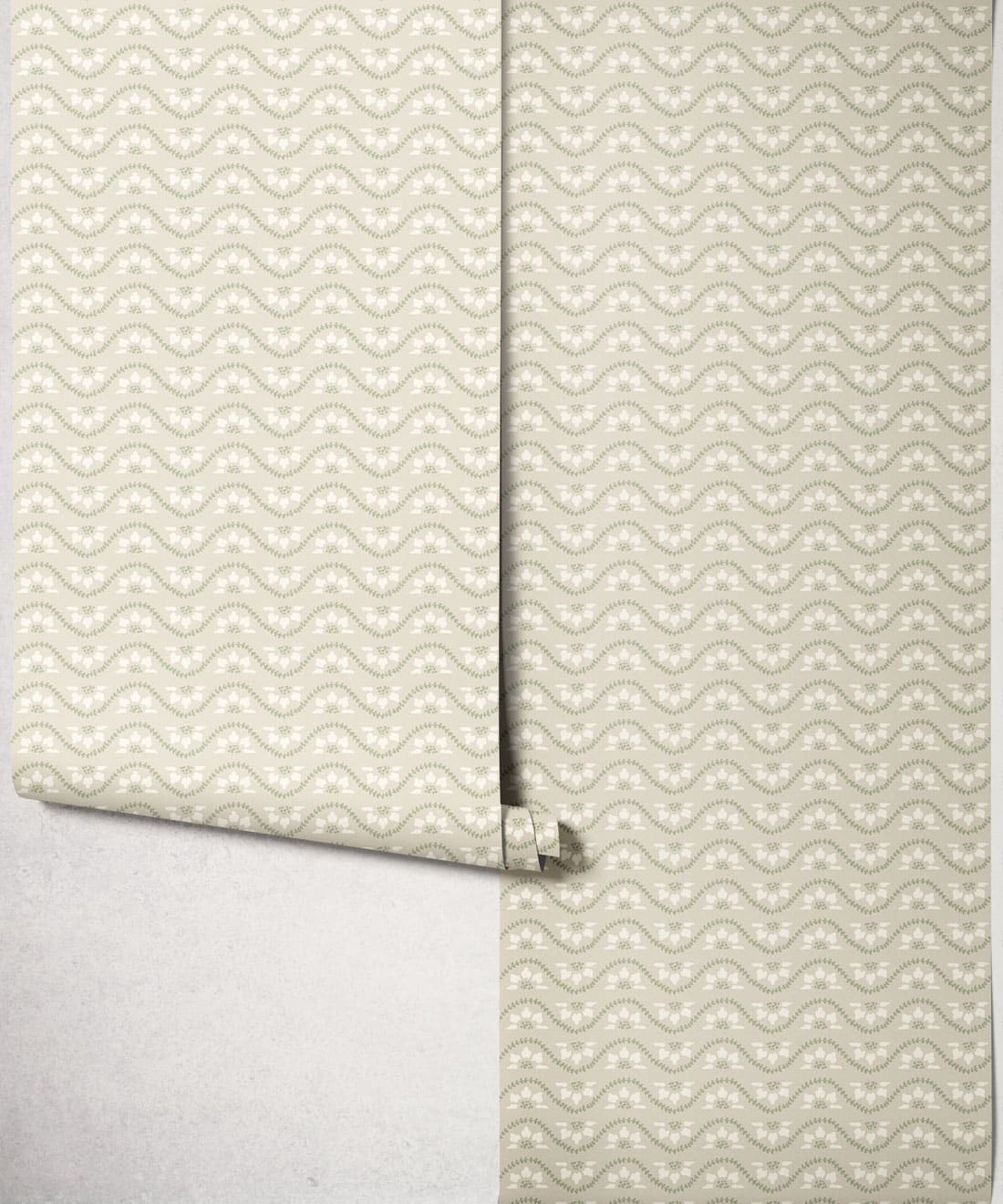 Rosette is a small scale horizontal stripe wallpaper featuring deconstructed flowers and winding vines arranged in a decorative repeat. The design draws inspiration from classic garden details and ornamental motifs found in traditional architecture.