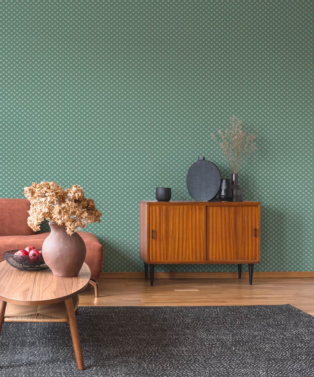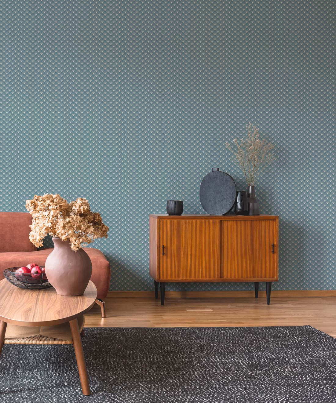 The ornamental Scallop design from Maeve Oliver’s Jewel collection is a sophisticated geometric pattern reminiscent of the Art Deco style, combined with the timelessness of ancient mosaics. Perfect for small spaces for a pop of colour or large spaces for a stylish feature. Available in three signature colours, Antique Moss, Bosco Blue and Dynasty.