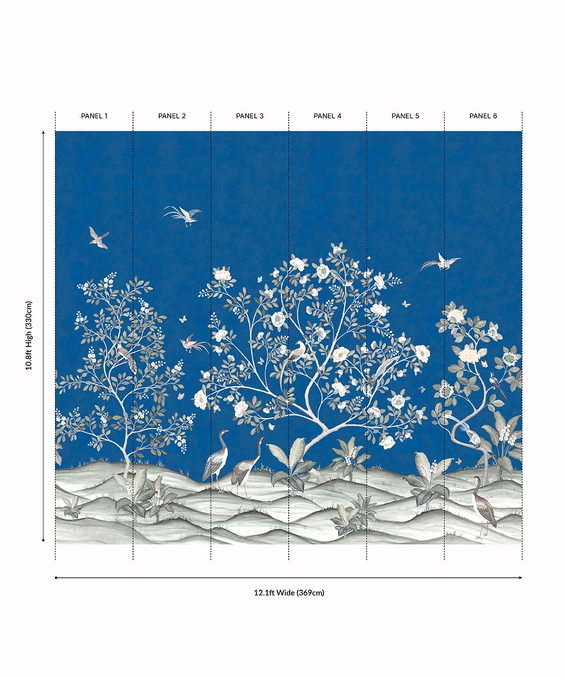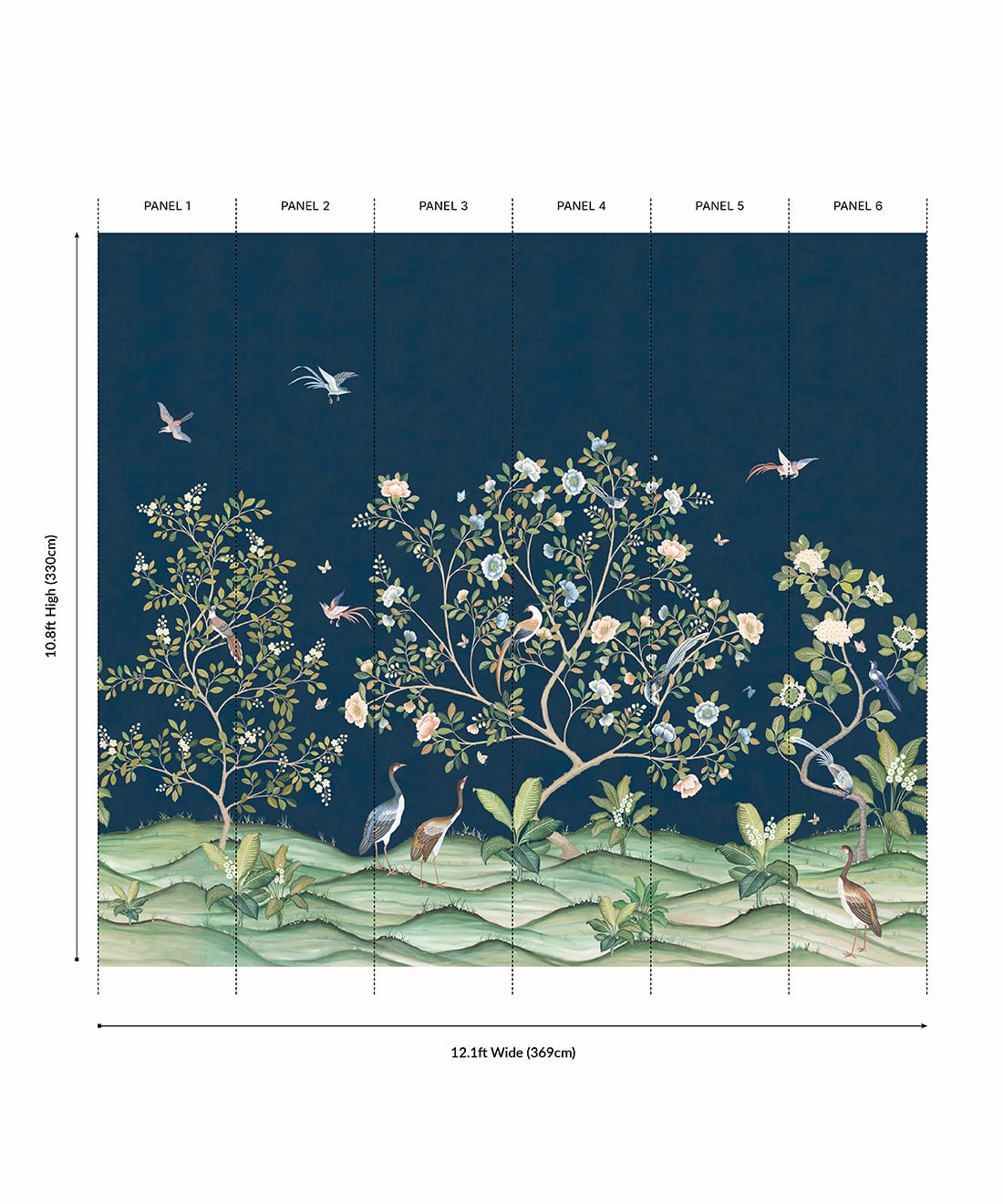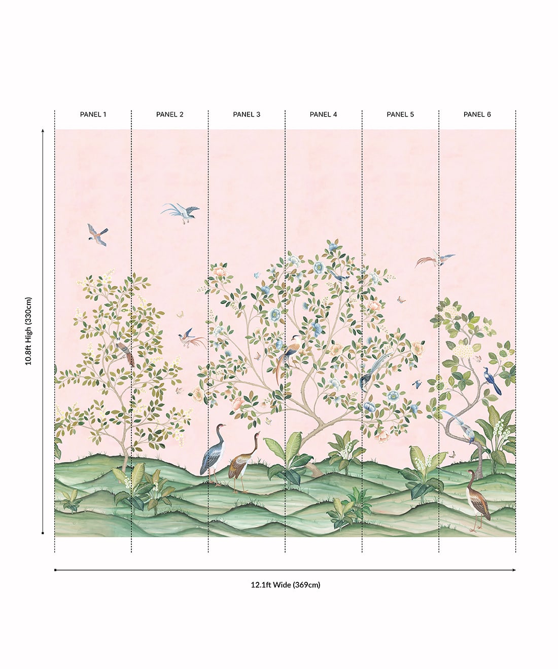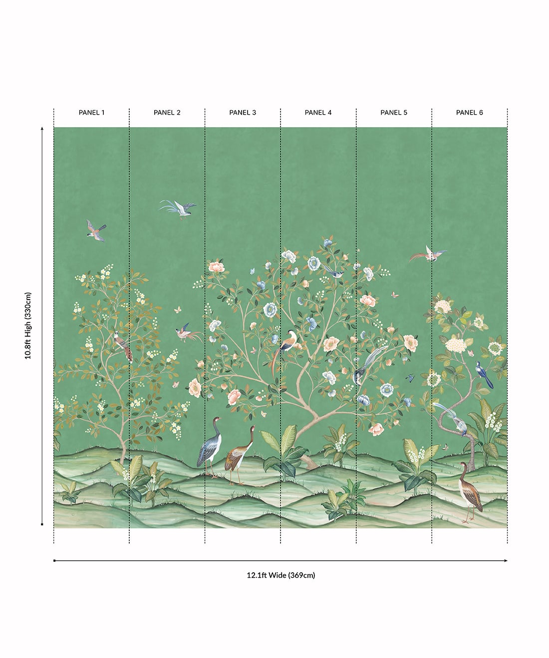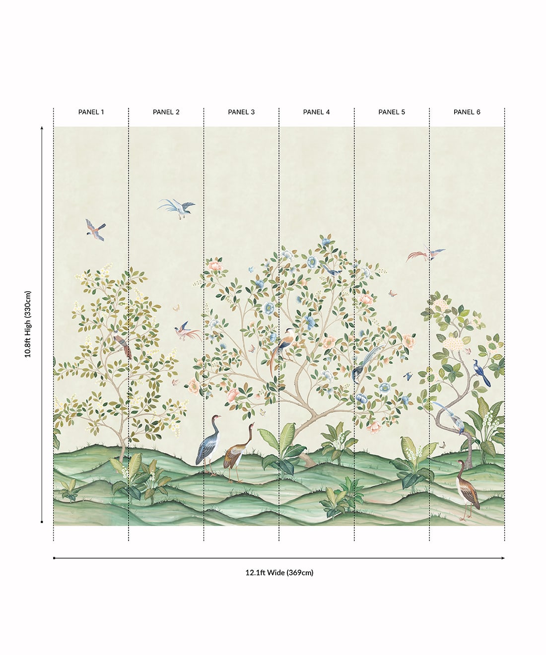 The Spring Landscape Mural from Bethany Linz is a Chinoiserie-style mural originally hand-painted in Gouache on stone henge paper. Inspired by a commission piece, the design allowed the artist to undertake a unique challenge featuring birds, butterflies, and botanicals. The six-panel mural captures the height of spring, when flowers are in full bloom and the various birds and butterflies are out to enjoy them. This design is a beautiful floral backdrop, perfect for an open living space, bedroom, or child’s playroom.