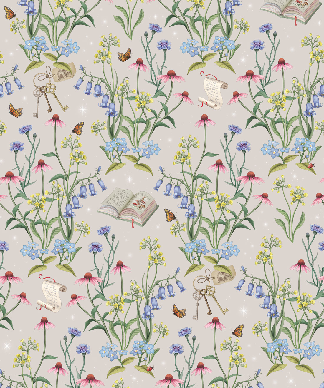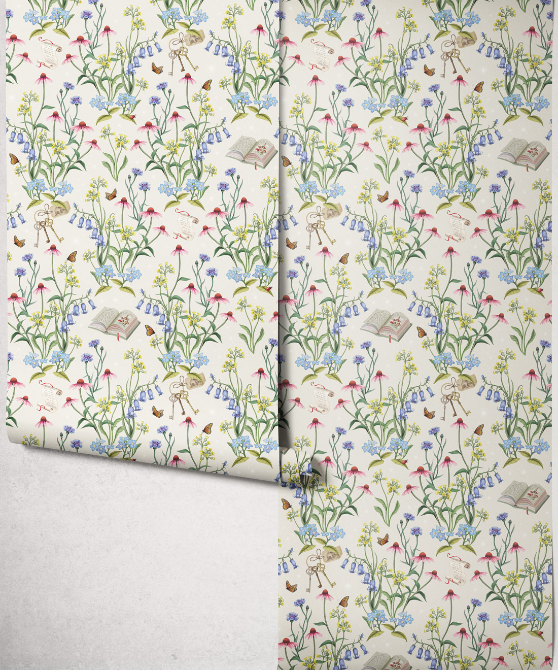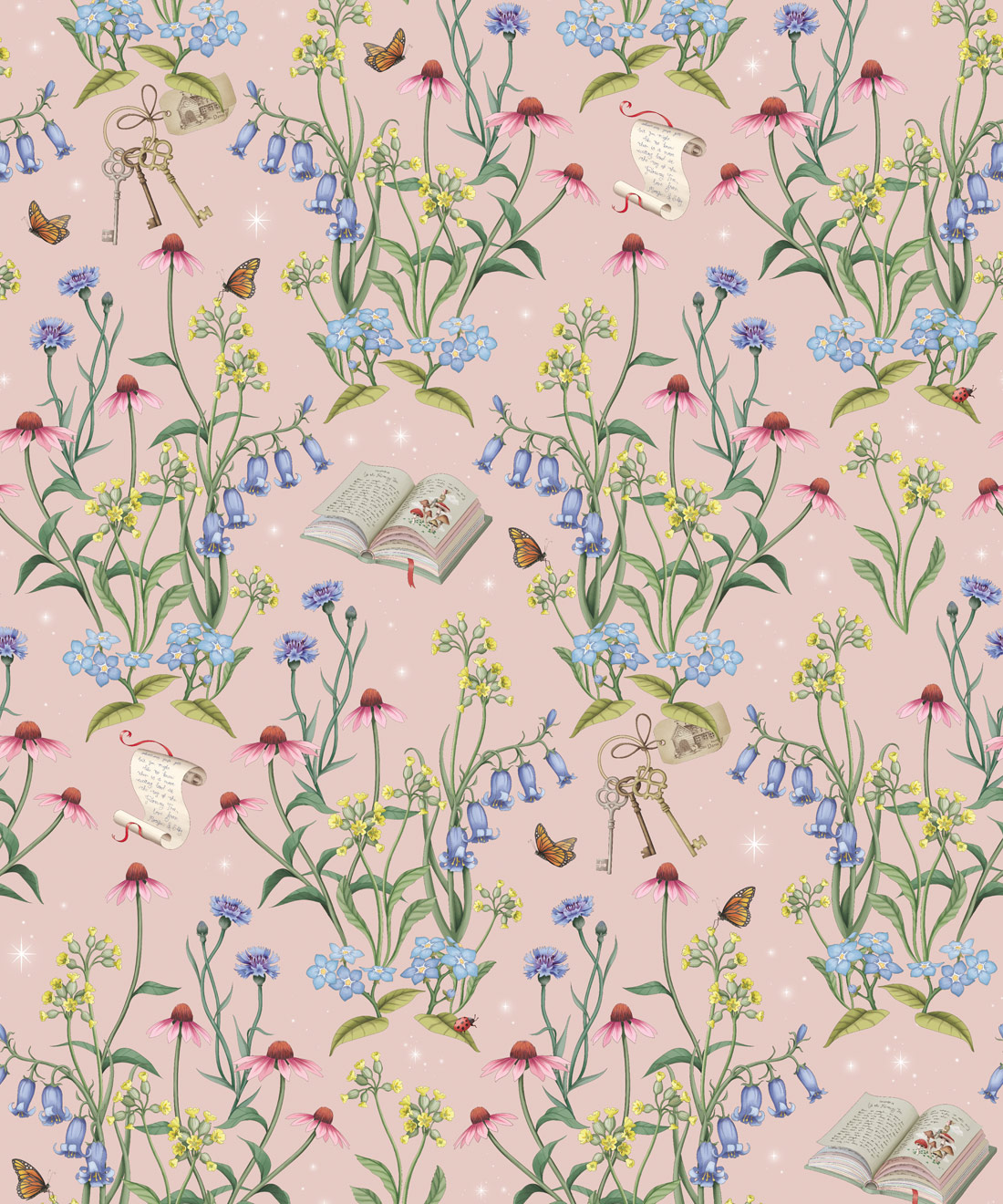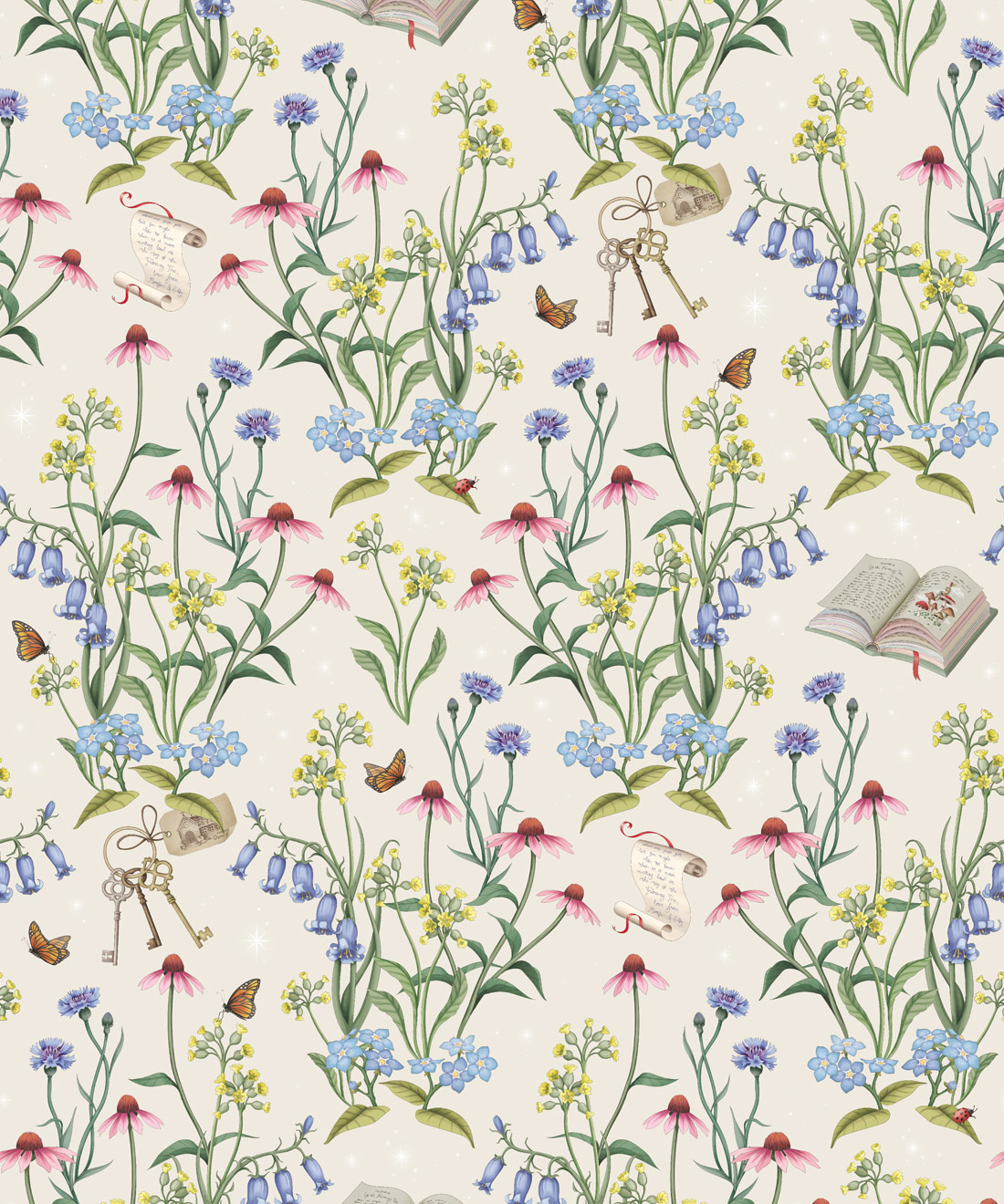 Delicate florals are layered with hidden storybook touches and gentle character details, creating a calm and whimsical backdrop inspired by the Faraway Tree world.