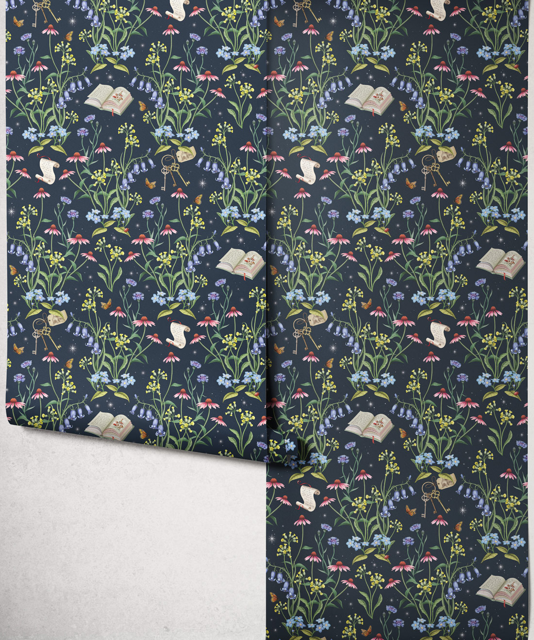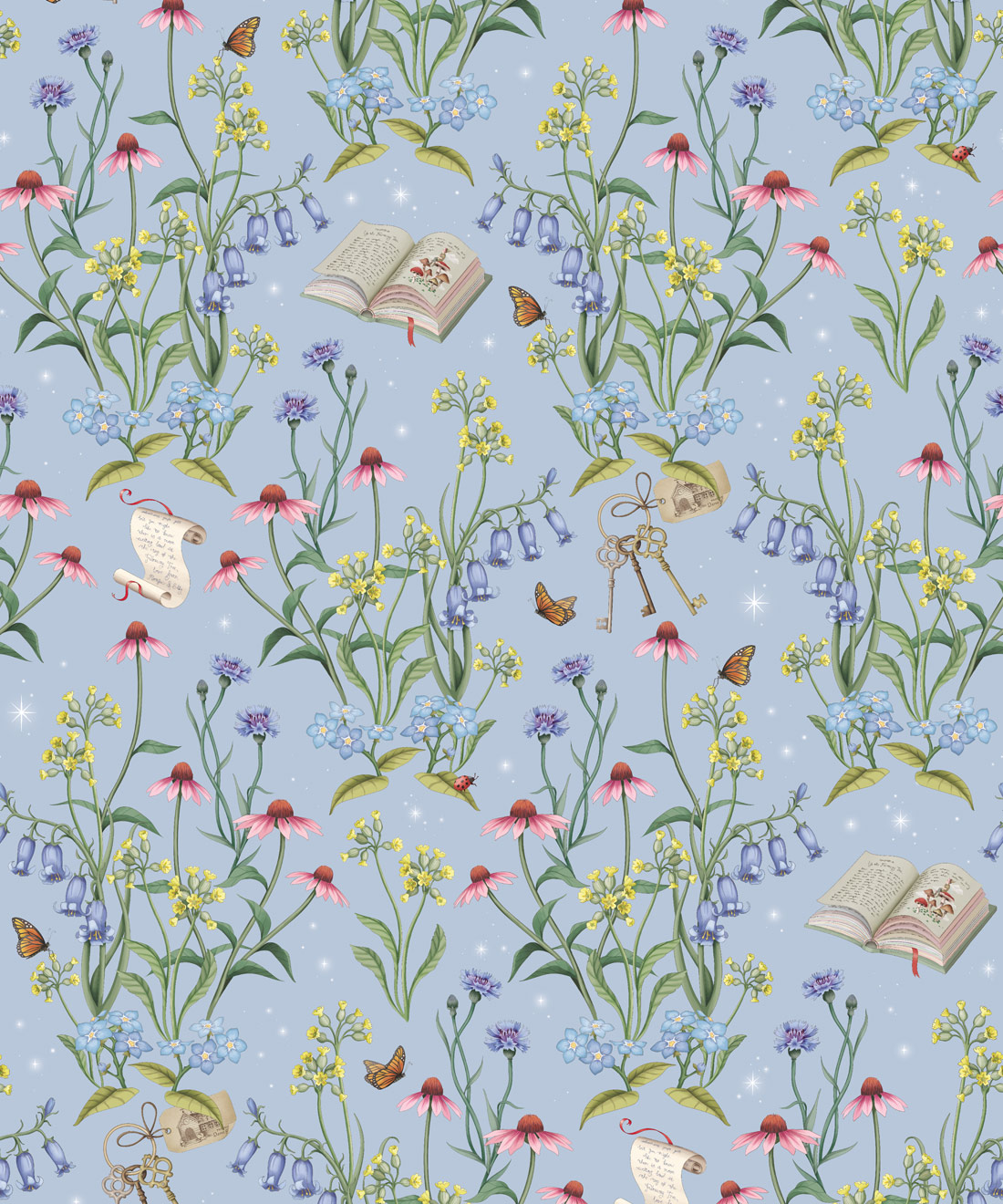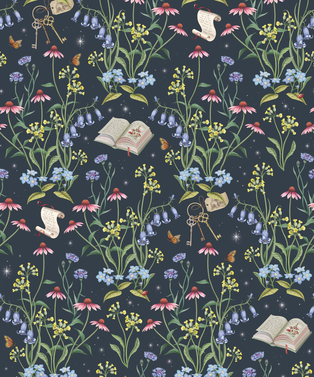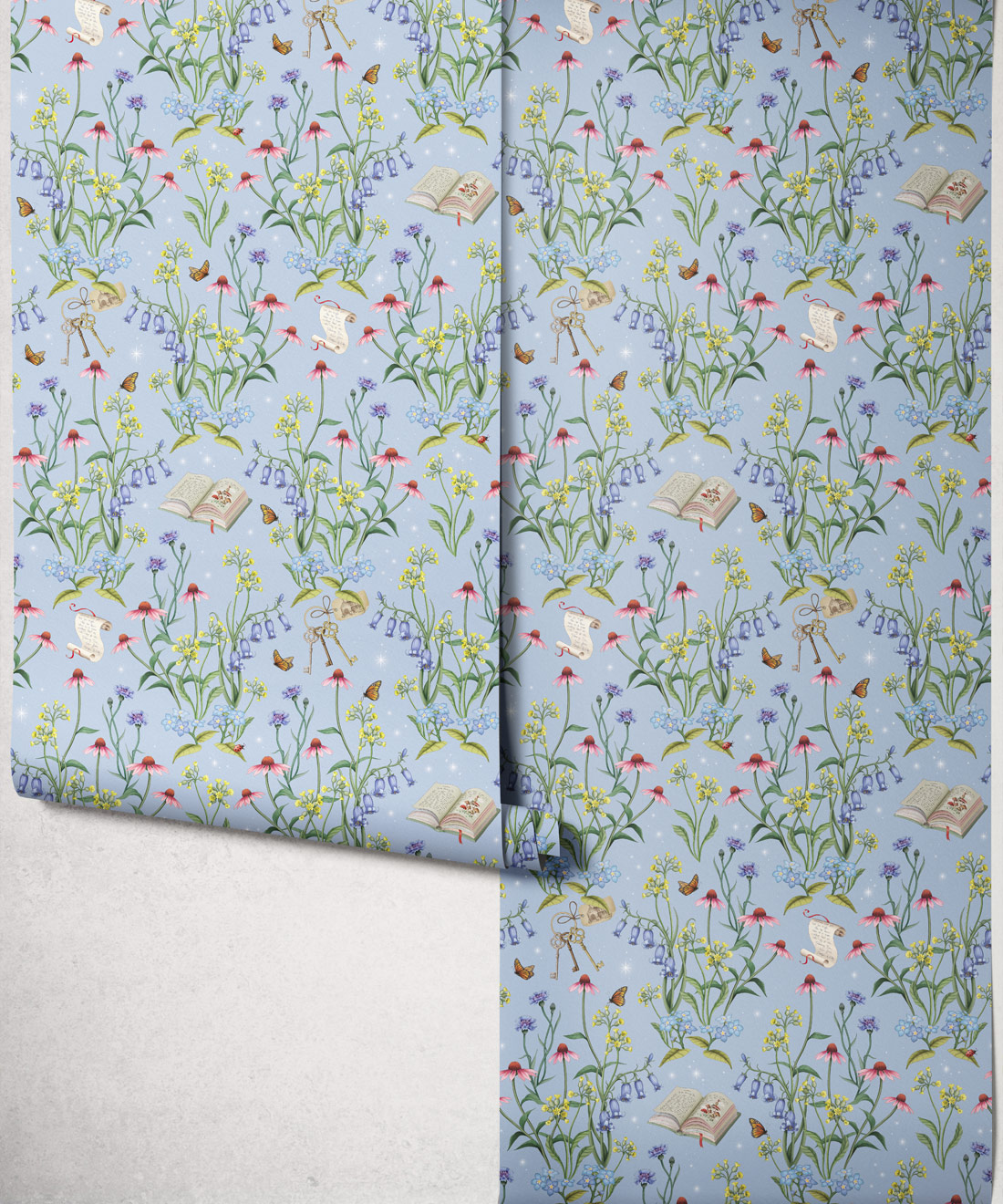 Delicate florals are layered with hidden storybook touches and gentle character details, creating a calm and whimsical backdrop inspired by the Faraway Tree world.