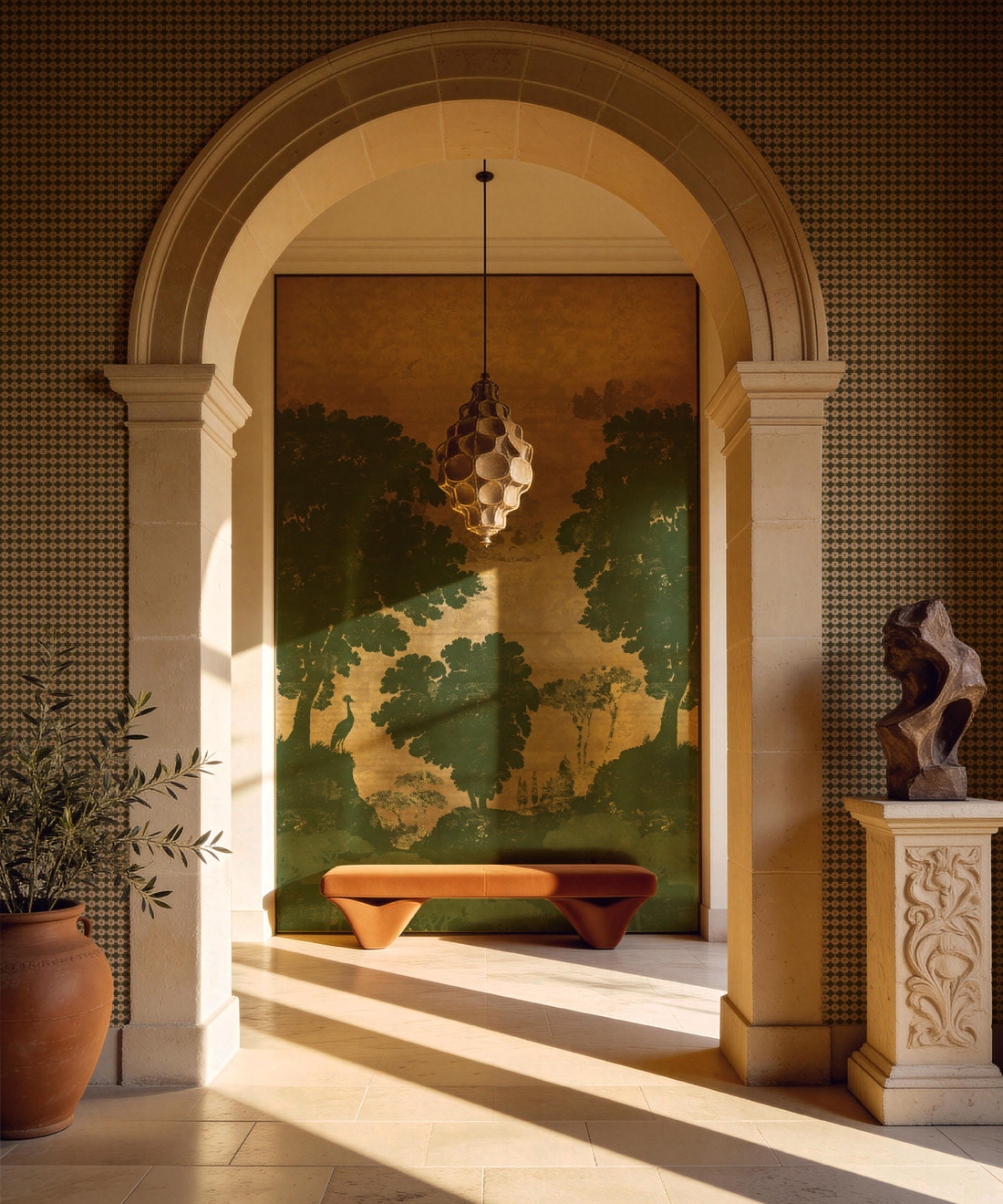 The Tuscan Landscape Mural is inspired by the unique landscape of central Italy. This mural perfectly captures the very heart of nature the Italian countryside possesses, from the beautiful rolling hills, the distinct outlines of the Italian Cypress trees on the horizon and the signature domes of Italian churches rising above faraway villages. Finished with refined gold or silver metallic detailing, the design adds subtle depth and light, inviting you to settle into your favourite armchair with a glass of wine and a good book and immerse yourself in the comforting tranquillity of Tuscany.